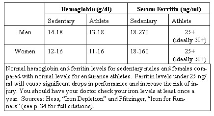 If your iron intake is insufficient for a prolonged period of time, the first effect will be low serum ferritin concentrations. If your serum ferritin remains low, you may develop anemia, which is a decrease in the amount of hemoglobin in the blood. There is no disagreement among doctors and scientists that abnormally low hemoglobin levels will cause impaired performance (as well as other problems). But something that’s not often well-known among the medical establishment is a phenomena called pseudoanemia. Endurance training can increase your blood plasma volume by 10-20%, and this effectively dilutes your blood. So, when the doctor runs a blood test, it canappear as though you have less hemoglobin than you really do. Say you have 30 trillion red blood cells in your body. If this number remains the same, but your blood plasma volume increases from 5 liters to 6 liters, a blood test which only measures the concentration (i.e. hemoglobin per unit volume of blood) of hemoglobin will falsely indicate that you have less than you really do. To compensate, two-time Olympic marathoner and coach Pete Pfitzinger (who, to his credit, also has a Master’s degree in exercise science) says you ought to extend the low end “normal” range for distance runners by one gram per deciliter of blood. Speaking of units, the “normal” range of hemoglobin values is 14-17 g/dL (grams of hemoglobin per deciliter of blood) for men and 12-15 g/dL for women. Pfitzinger extends this to 13-18 g/dL and 11-16 g/dL for men and women, respectively. It’s important to note that different laboratories use slightly different cutoffs for the ends of the normal range, hence the differences at the upper end. These values and others are recapped in a table a few screens below. From what I’ve read pseudoanemia does not seem to affect ferritin readings.