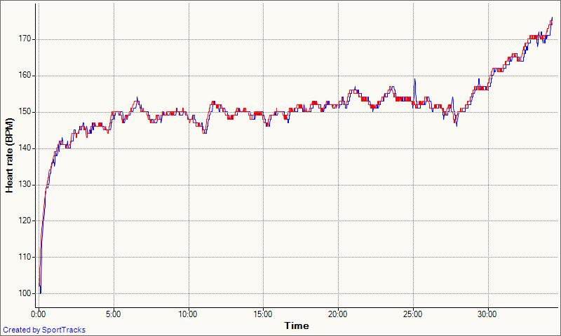 Visually whenever I glanced from one device to another I suspected that the Scosche might be 1bpm lower. It certainly seemed to be lower at sub 100bpm HRs but those level of HR are of little interest to sporty types. Again when going up over 170bpm the Scosche seemed maybe a tad lower.
