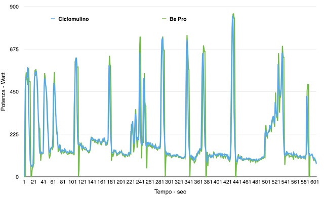 The full test and commentary are at the above link. My take on these results would be that the Ciclomulino trainer reports generally slightly lower figures than bePRO.