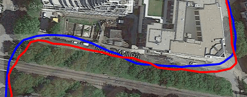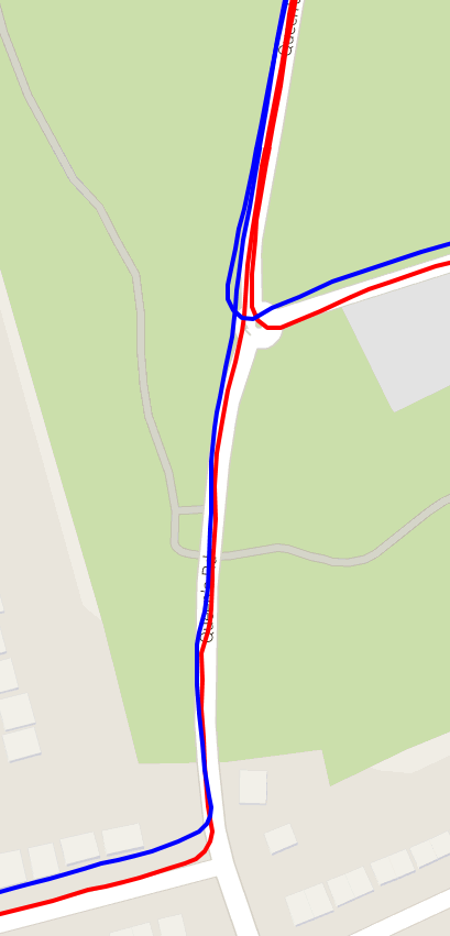 The all green open-park image with few trees shows the two devices matching each other neck and neck for the GPS track. No curves and fairly fast riding.