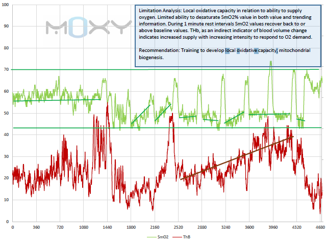 For longer sessions there is more generic advice, “Having high O2 availability also seems to help with endurance development. So during endurance steady state exercise, we recommend cycling with a high, near max, attainable SmO2 and at a performance level where this smO2 can be maintained in a relative plateau.” So I’d probably start in Z2/3 power try to maintain 50%SmO2. Try to get that sustainably lower (48%??) by trial and error and then aim for that level normally in longer sessions. As the longer sessions progress it would be likely that I would drop my power level to maintain the SmO2 target.