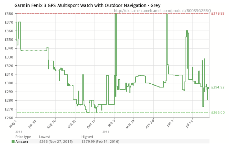 Here is an interesting price history of the Garmin Fenix 3 – one of the base models. It’s in GBP but the same principle applies to other currencies.