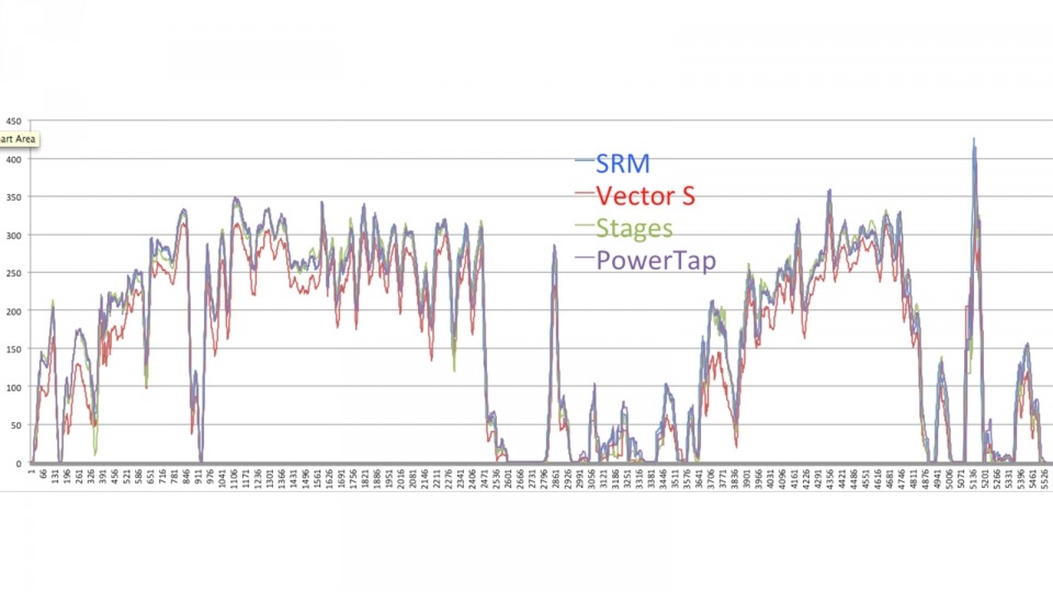 The following test from 2013 also shows a notable variation between the Vector and PowerTap (orange line)