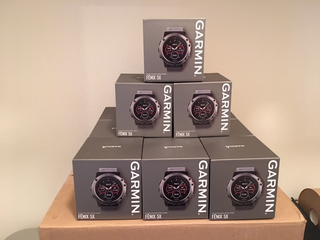 This week’s delivery of Fenix 5x devices for PowerMeterCity is shown on the right.