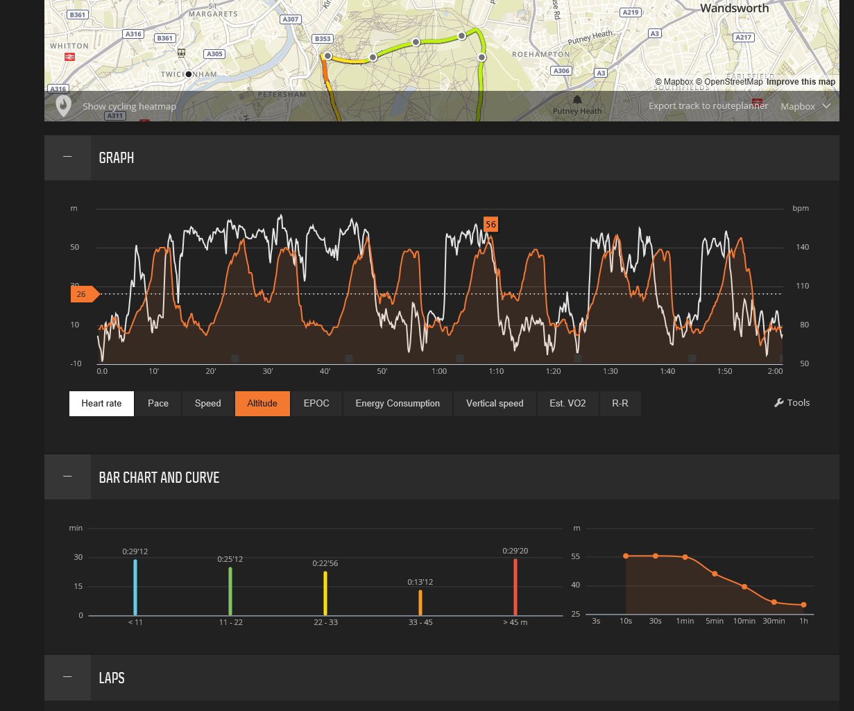 The only annoying part of the in-sport experience, for me, is at the end. The SPARTAN seem SLOW to get through the post-exercise summary/lap/feel/save screens. OK you can turn off the ‘feel’ screen – aka smiley/sad face screen; and the lap screens are good; and the plots of HR/elevation over time are nice. But I’m not into any of that stuff I just want to save the file and move on. It’s also a bit slow at then physically saving the file. Very mildly annoying at worst – I can and do live with it.