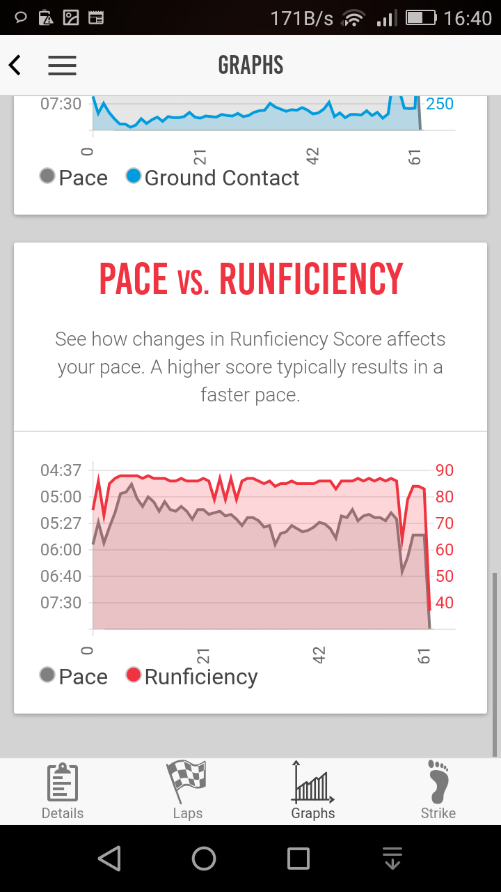 The app has some straightforward and nice charts showing how stride-length, GCT, cadence and RUNFICIENCY all vary with PACE.