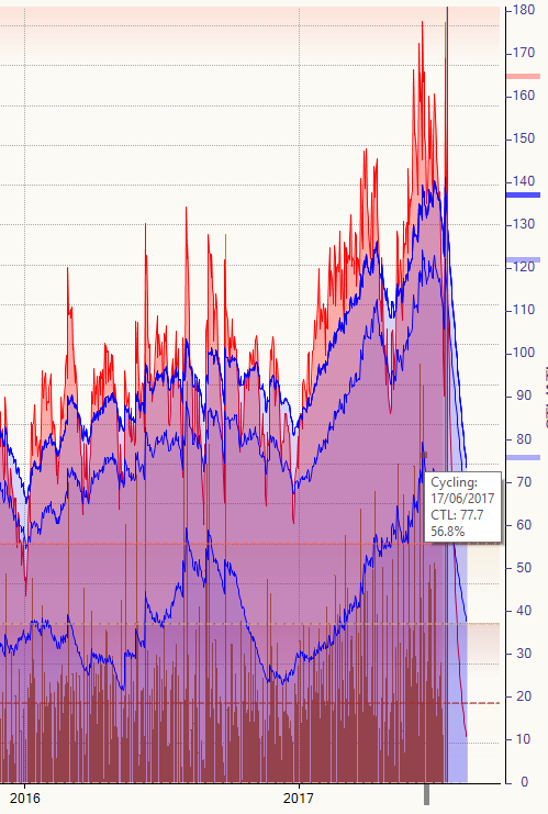 I probably started to feel less than optimal (but still good) at somewhere around 80/90 miles. If I were on a 110-mile bike ride, I would have put the hammer down at that point and still finished strongly. But clearly more was to come, so the hammer stayed in the tool bag. Interestingly, this is a chart of the PERFORMANCE CONDITION metric from Firstbeat on my Garmin – it seems to agree with how I felt. I only looked at it afterwards, but it didn’t seem too unreasonable. I might have to look at that a bit more closely in the future.