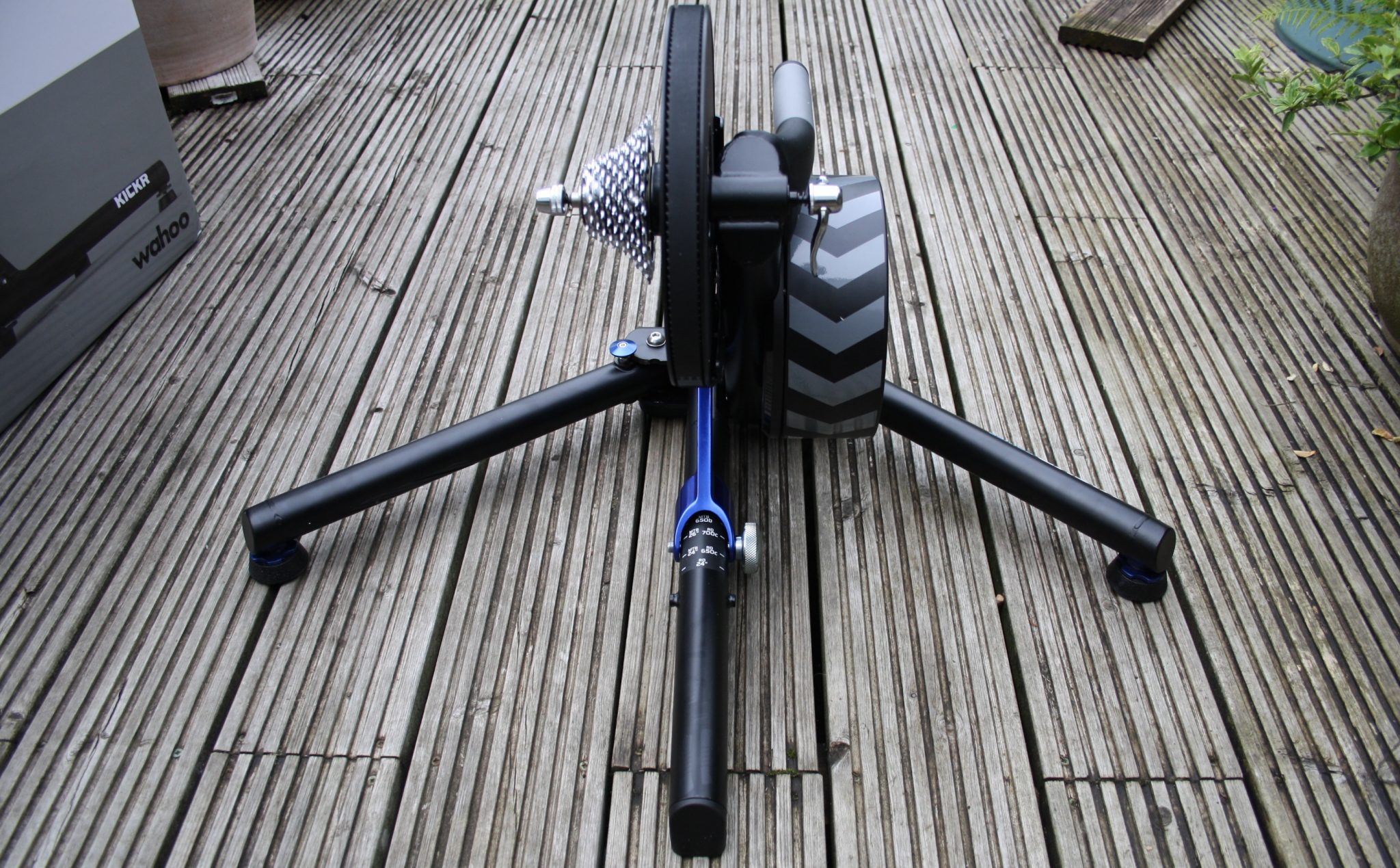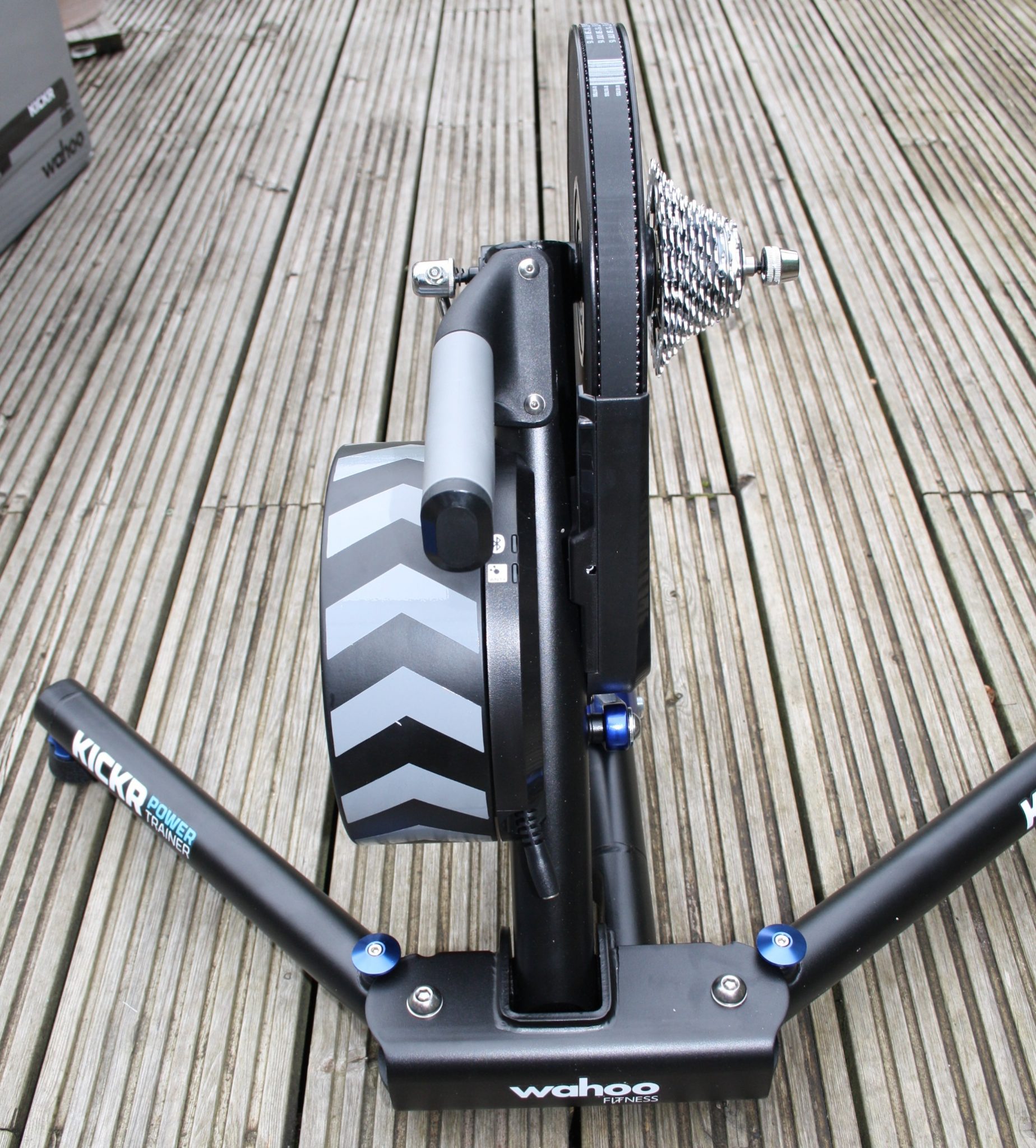 Before we have a look at the setup, just briefly look at the KICKR when fully assembled and ready to take a bike. The things to note are 3 supporting feet; a carry handle; a fly-wheel/resistance mechanism driven by whatever is fastened to the cassette ie your bike.