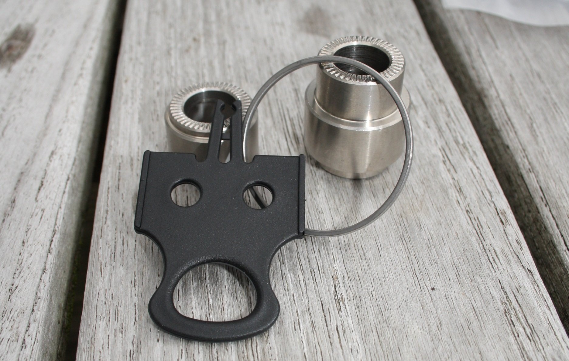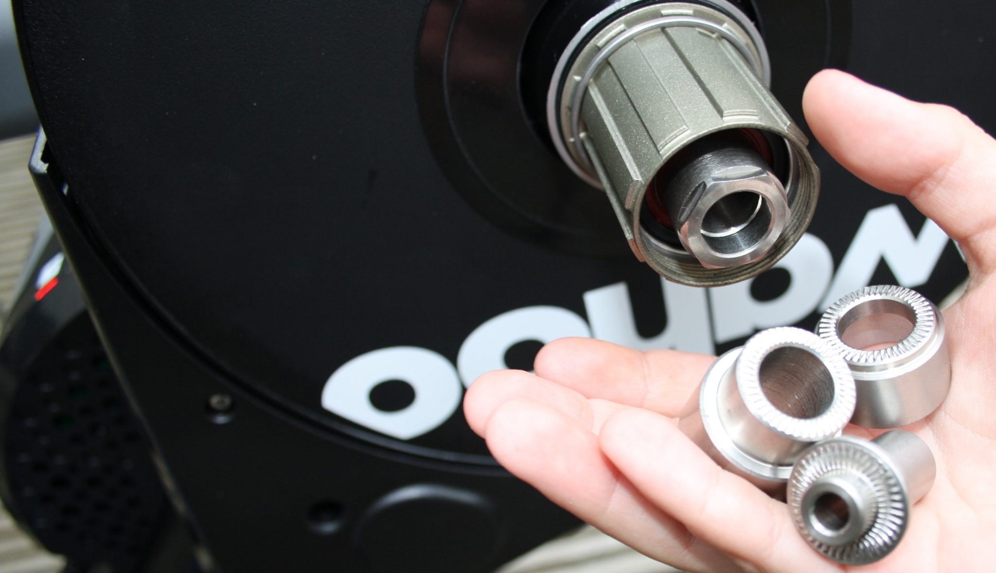 You get the KICKR itself and all these bits. You’ll know what most of them are but of note, we see: the black bit to protect disc brake pads; a spacer to enable your 10-speed cassette to fit; 3 adapters for KICKR CLIMB compatibility – I’m using the one for a standard skewer.