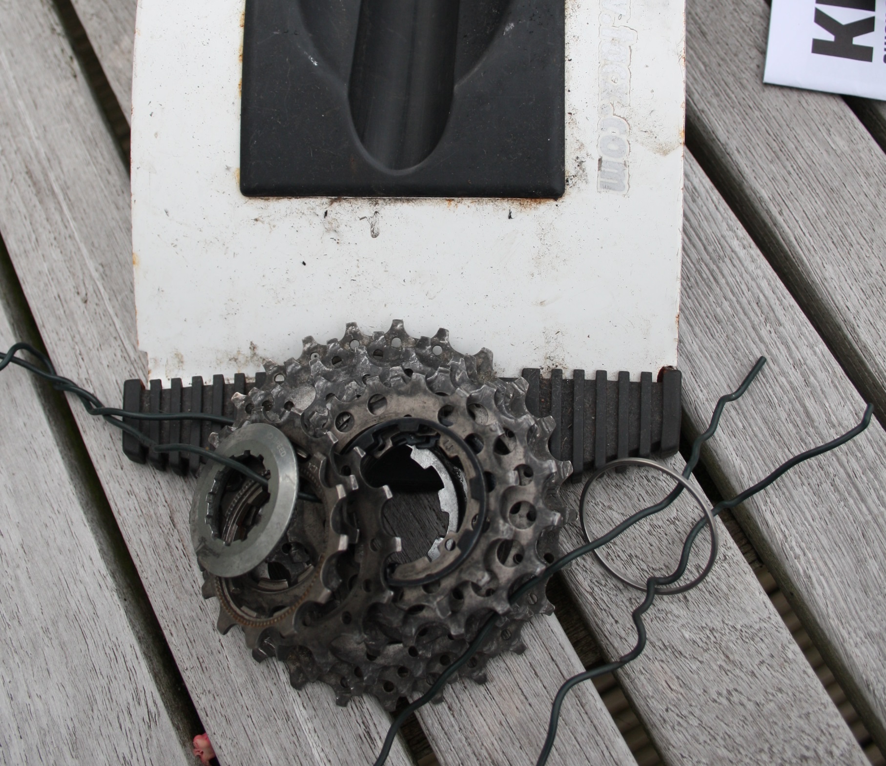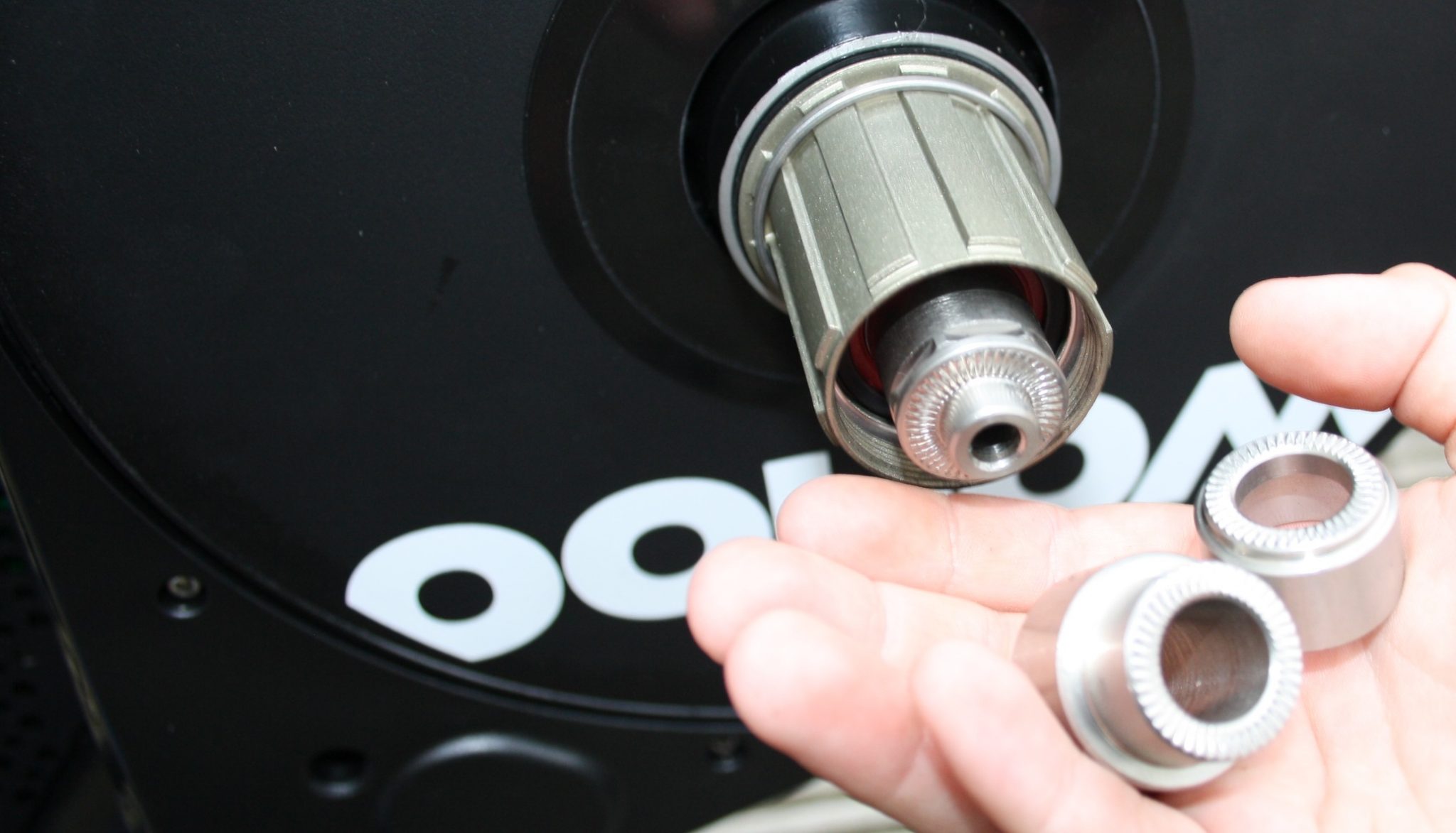 That’s fine though. No doubt most of you will have a spare cassette, like me. You might also have a spare riser. But you won’t need the riser! cool. Because there is no rear wheel with the KICKR then it rests at the right height for your normal front wheel. But getting the cassette on needs more than just the cassette. First up make sure you have your existing innermost spacer – the one on the right in the picture below – you will need that AND THE ONE PROVIDED.