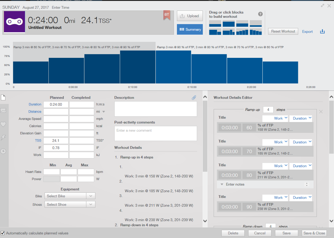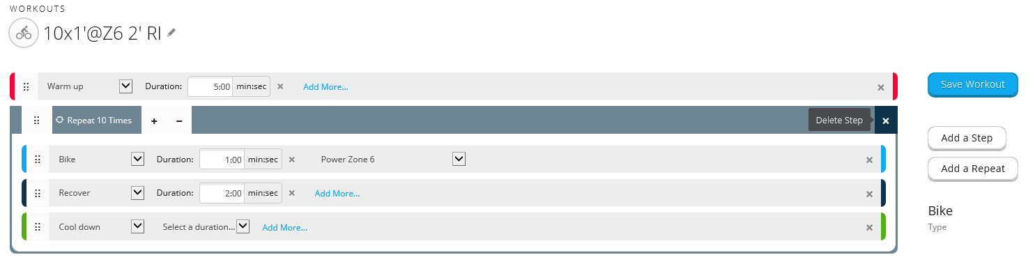 If you want to follow a plan or structured workout then WAHOO does NOT provide that facility. Instead, you could use the free/basic version of TrainingPeaks or subscribe to Today’s Plan. I’ve shown some screenshots of the workout builder from TrainingPeaks, below. The workout builder IS a little confusing at first but there are usually several ways to end up with the result you want. The great thing then is that your workout just finds its way to your WAHOO ELEMNT/BOLT. The whole process is well-integrated and I would certainly use it if I needed to.