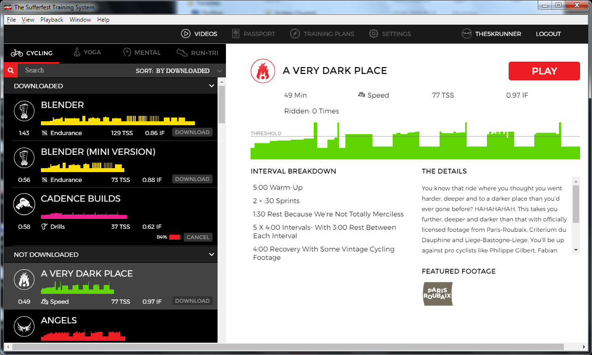 Set in the fictional virtual realm of Sufferlandia, Sufferfest is a structured training program augmented by the use of video footage from ‘proper’ races eg TdF. You might get a “60-day free” offer when you register your KICKR but beware that this is a little disingenuous as you actually get a week free trial period and then a credit for the rest of the 60 days spread over a couple of months.