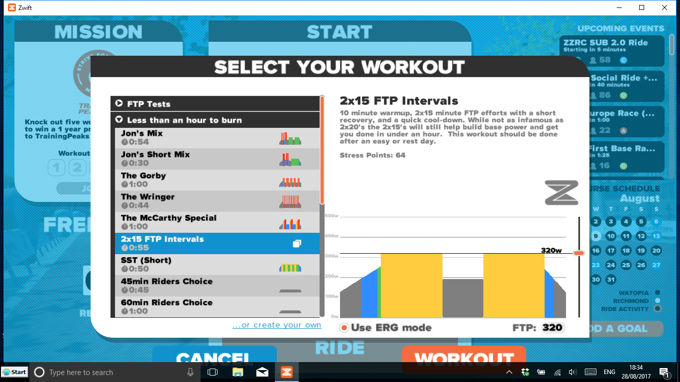 - Game mode. Just doing what you would do normally outside…but inside…against electronic people on a faraway island that doesn’t exist. Of course, this is just as good as training outside in terms of the physiological benefits. And you don’t get wet when it rains…or crash.