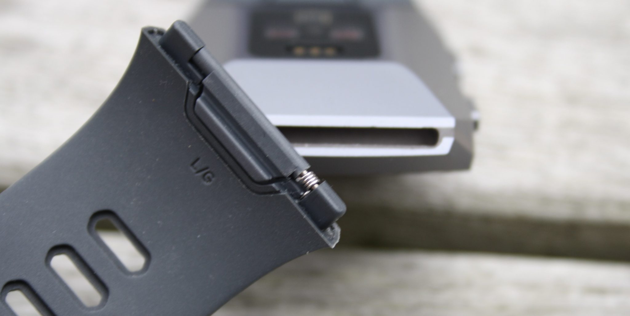 Here are some close-ups of either side of the watch and a detail of the strap mechanism. Although one spare set of straps is included, if you think about it you can mix the large with the small to make a medium set. Genius.