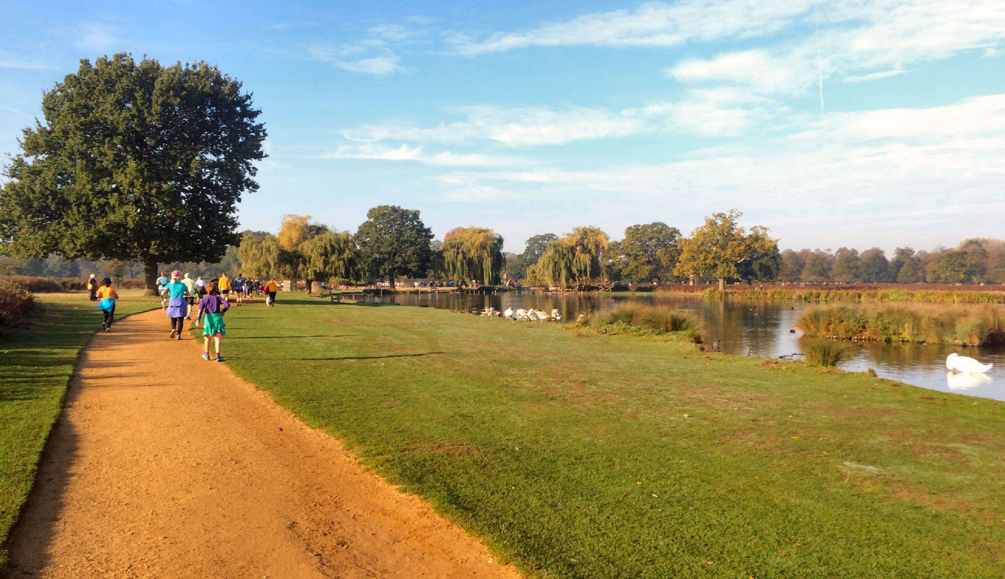 There is large, free car park next to the start, another at The Pheasanty Cafe and yet another further westwards of the cafe – probably a km away. With regular attendances over 1000 you had best arrive EARLY if driving. The nearest train station is the relatively poorly served Hampton Court; with Hampton Wick being closer than Teddington and on the same line. Locals tend to walk or cycle. parkrun tourists might consider staying in Teddington’s Travelodge.