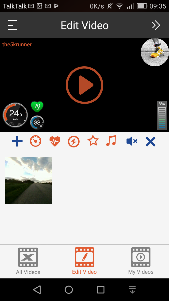 Let’s start off with a manually recorded and uncropped clip for nearly 40 seconds going up a hill. The video shows how you can overlay your name and add an image of some sort. The cool bit is that you can add your actual HR, speed, cadence and power to the clip afterwards.