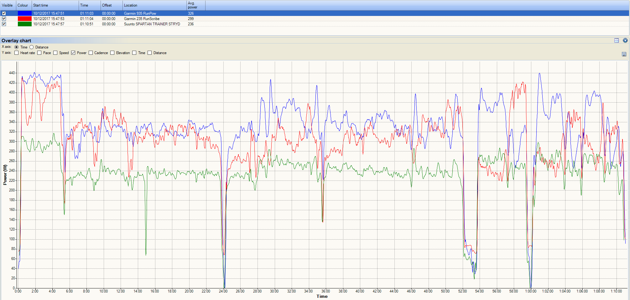 I have been running with 2 watches Garmin 920XT and Suunto Ambit3 using a STRYD Power foot pod. I am also wearing 2 different chest HRM’s ( Garmin and Suunto for HR ). My two watches show very similar Average Power (within 5 Watts around 2.5 percent.) and Average Heart Rates ( also within 4 bpm’s around 3 percent. Over the year, I have run about 250 times. From 2 to 10 mile runs. Using an Excel Spread Sheet, I have been entering the data into a Performance Management Chart that shows among other Metrics my Average Power, Average Heart Rate, Average Pace, to chart my Critical Training Load ( CTL ) over 42 consecutive days, Acute Training Load ( ATL ) over last 7 consecutive days to determine my Training Stress Balance ( TSB ). I then made a graph of 3 Metrics, Avg Power, Avg Pace, and Avg HR. The graph was using my Average running Pace for the 230 runs eliminating any HRM or Power Sensor failure runs due to low Battery voltage. It showed me that as my Pace went down, my Power when up as well as my HR which should be the case. But with 230 points, the resulting graph showed 3 good very presentable resulting lines. I was also, from the graph, able to determine at what pace I need to become more efficient where the Power line starts to increase non linearly. For me it is around 8:30 min per mile. I am going to have to do more speed work / intervals. This will allow me to improve and move the linear Power line more to the right as I lower my Average pace times into the 8:00 pace times.