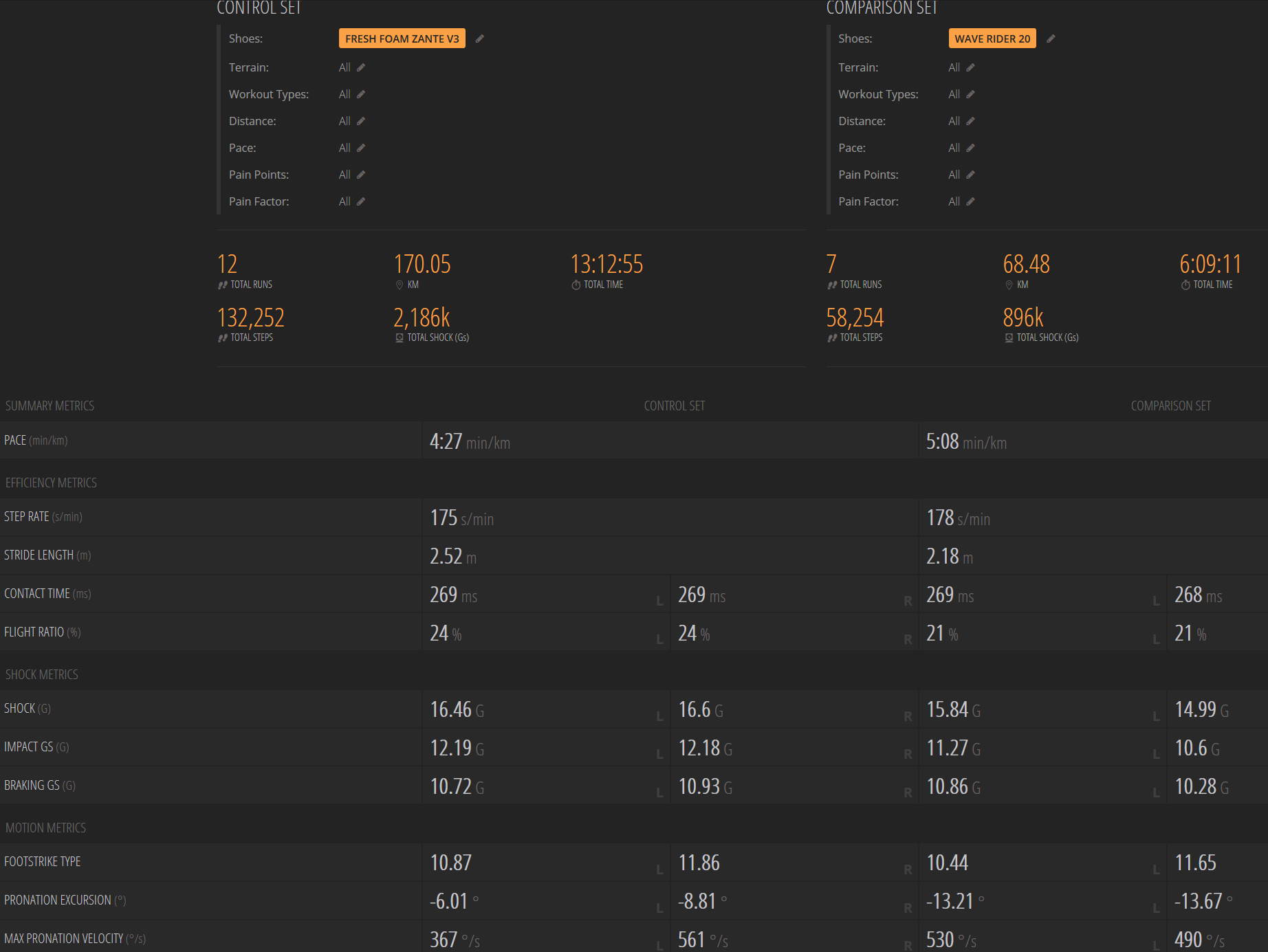 Also the Zante has a higher SHOCK and that too is strange as I get less injury with them. But then look at the PRONATION EXCURSION; the WAVE RIDER is higher there, maybe that is the source of my injury problem?