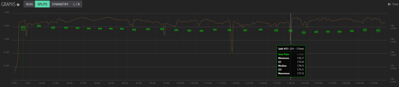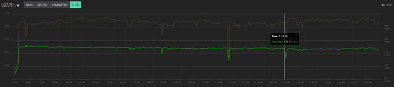 So, for example, here you could easily look at different splits where you are running at different speeds. Within those splits you could look at the power from each, you could then delve deeper to see leg L/R Stride Length and the L/R Ground Contact time and the Step Rate symmetry.