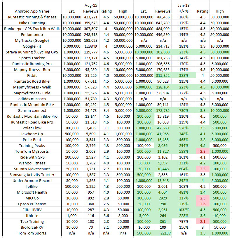 These are stats of sports apps showing: the number of ratings; and Google Play’s estimate of the broad range of the number of installs eg Garmin Connect is said to have between 5 and 10 million installs to Jan 2018. Google Play obviously only shows global Android installs but kindly also gives us the exact number of reviews and the current aggregate review rating. So we have some indication of the user base as well as the engagement of the user base.