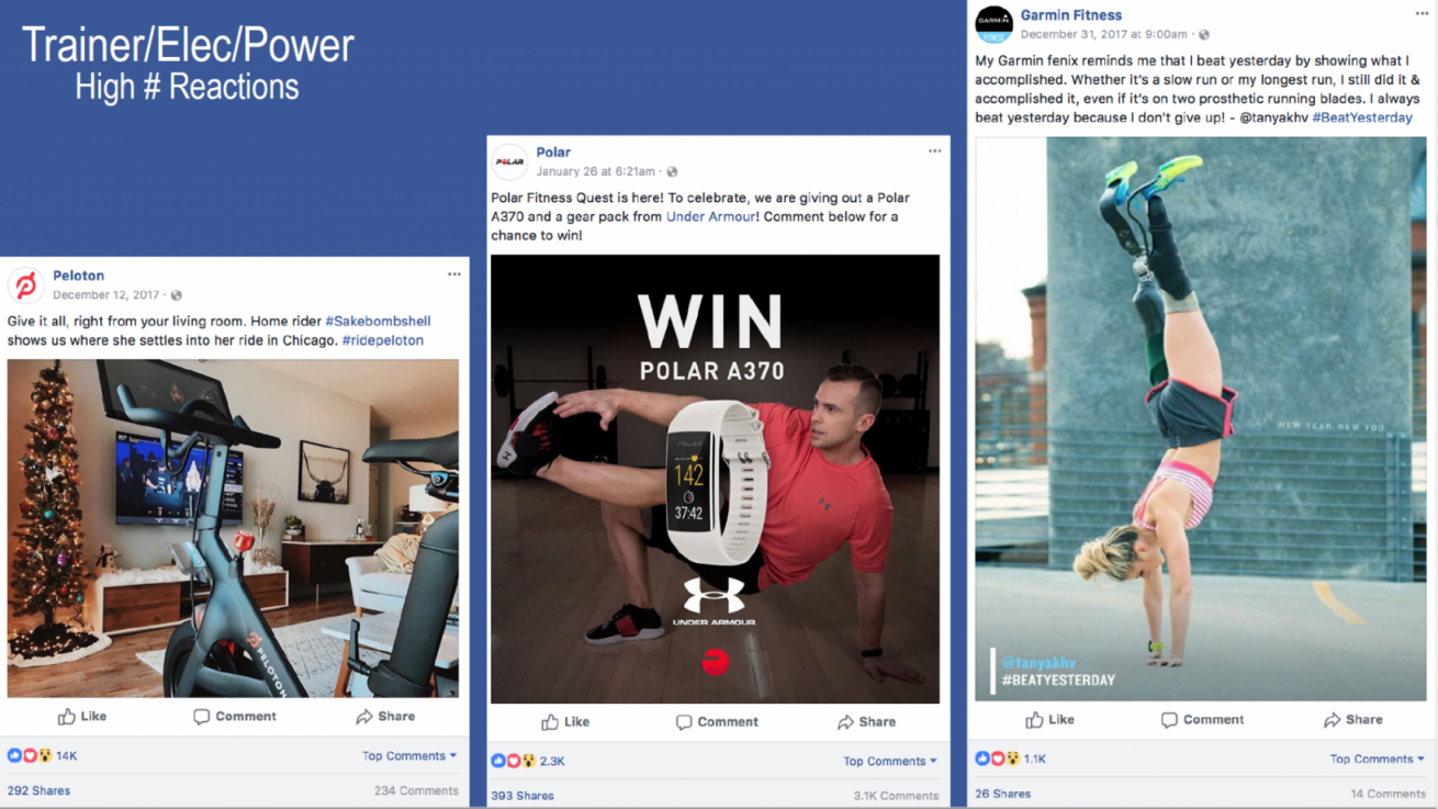- Top posts include: giveaways, bike pictures, stories about athletes, training tips, motivational stuff, new products
