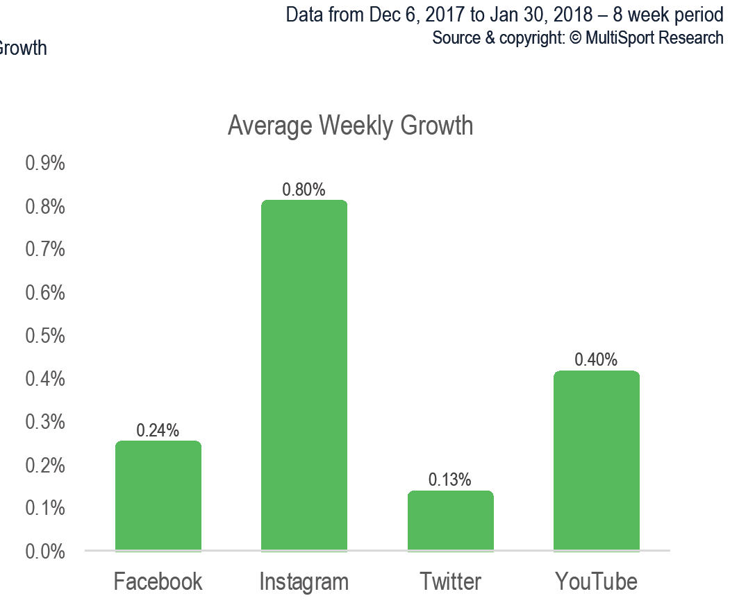 The Facebook platform provides the largest ‘Fan’ base in endurance sport with Instagram catching up in second place. Median numbers of fans are: Facebook (40k, up 0.24%), Instagram (16k, up 0.8%), Twitter (6.5k, up 0.13%), YouTube (2k, up 0.4%)