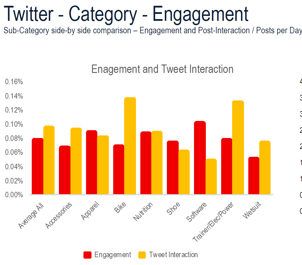 Here are some of my favourites for each of the 4 main channels. Bear in mind that some of these stats need to be put in context ie comparing power meter company stats with shoe company stats may not be too valid. The report DOES look at the industry sub categories of the 280+ Gear Companies included in the analysis. For the Endurance Sport Social Analytics (ESSA) Gear report, the sub-categories include: Accessories, Apparel, Bikes, Nutrition, Shoes, Software, Trainer/Electronics/Power and Wetsuits.