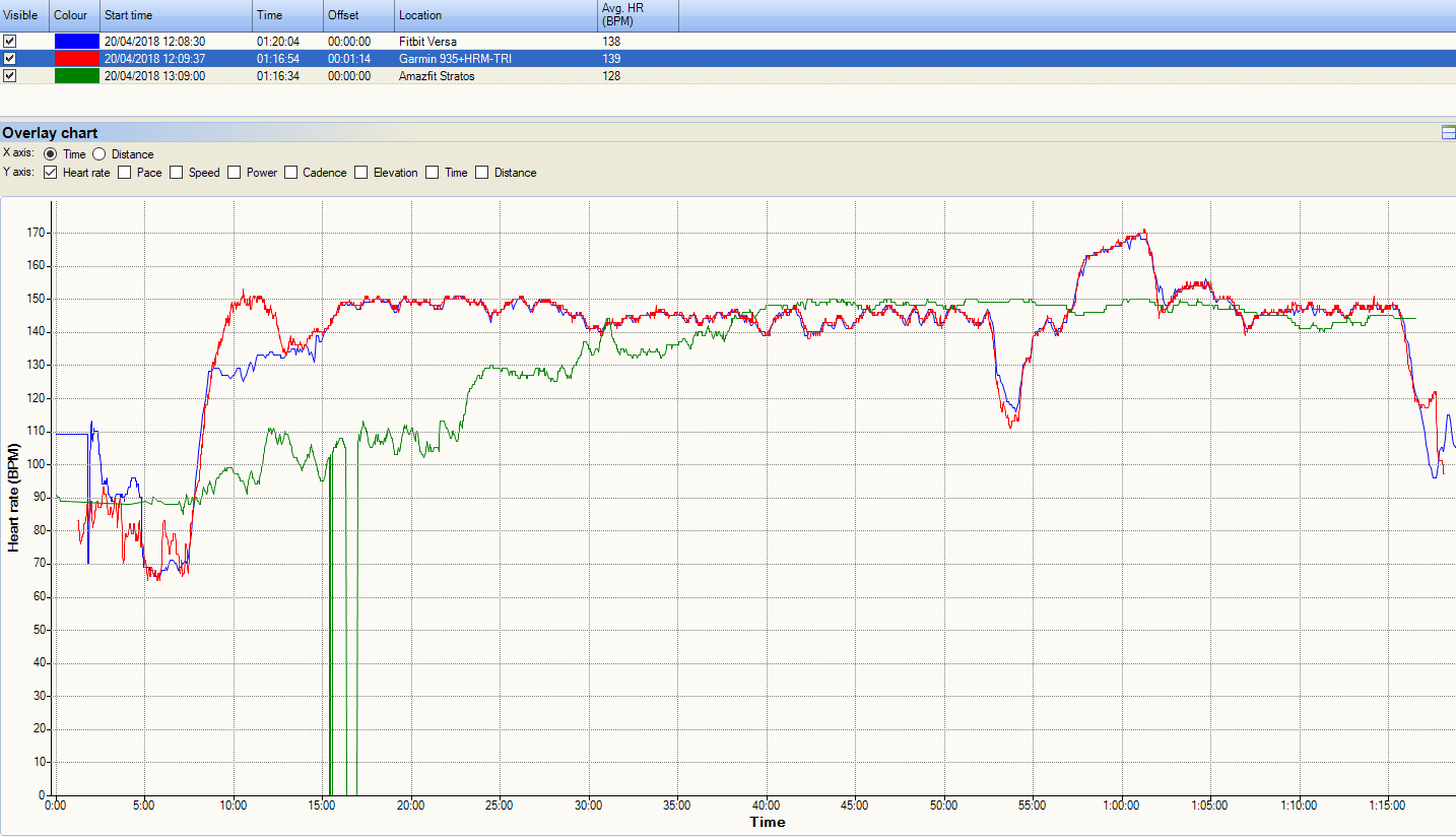 Here is an example of a run with the Versa performing well against Garmin’s top-notch chest strap, the HRM-TRI. It’s an old strap and, as you can see, there is a bump in the red line of the Garmin near the start. Here the chest strap is probably wrong and the Versa is probably correct. The green line is the Amazfit STRATOS and that’s, err, wrong.