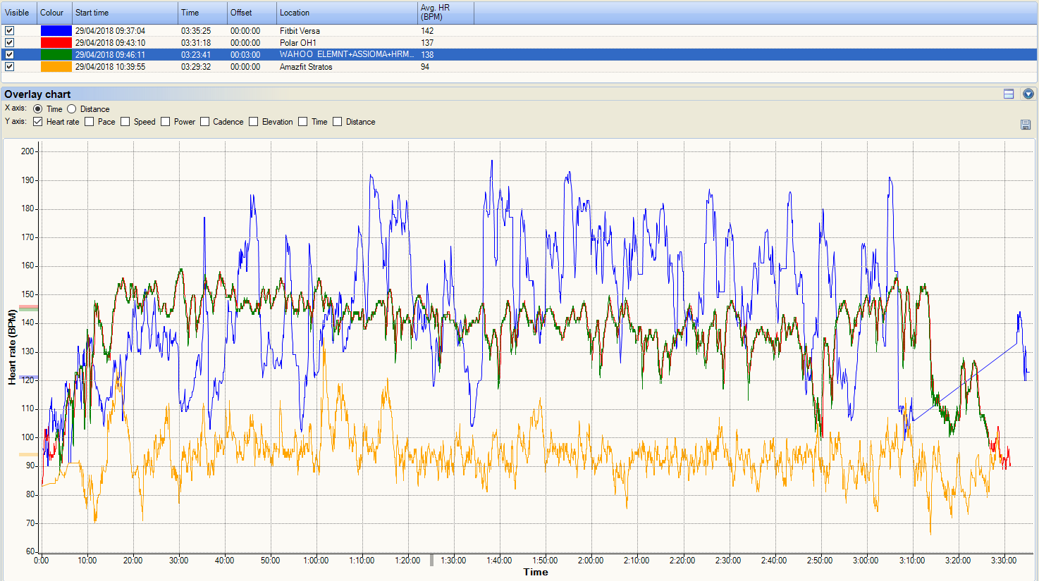 Here’s an example of the heart rate from the Fitbit Versa while cycling. It’s rubbish. Then again, it’s not quite as rubbish as the Amazfit STRATOS (also shown).