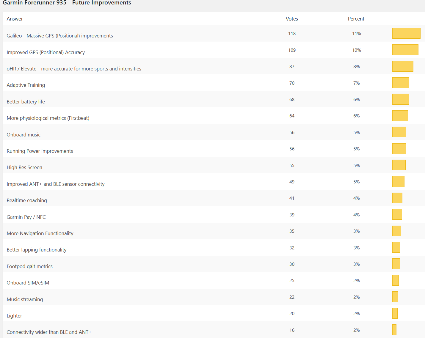 1058 votes is a reasonable amount. The results are mostly what I expected with many of you wanting increased accuracy, a better battery and more sporty insights to your training.