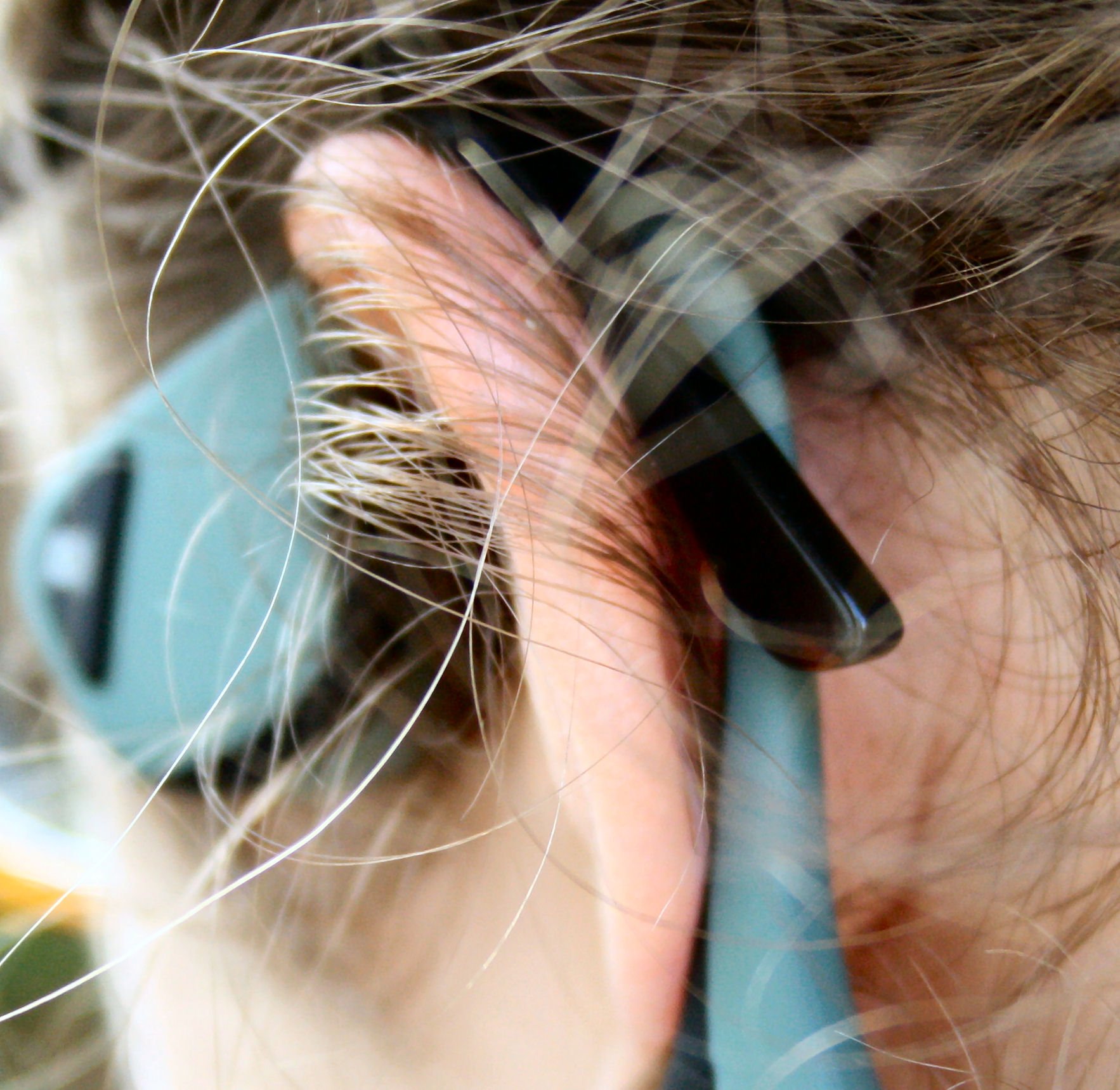 - People with long hair may experience some mild annoyance if their heavy hair keeps pushing down the wire to the rear. Although you could equally wear over the hair to the rear (the person shown has a LOT of hair)