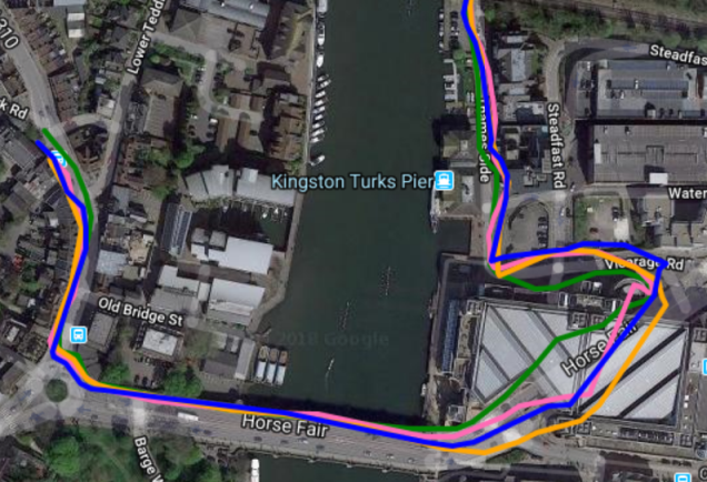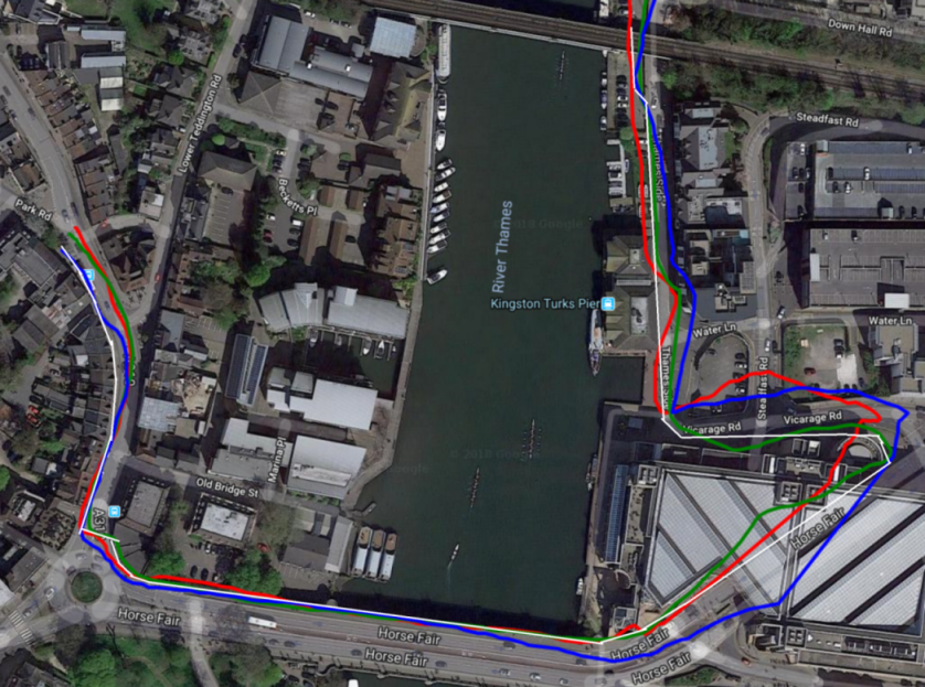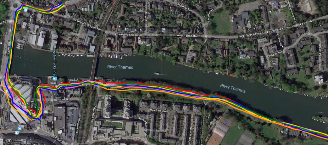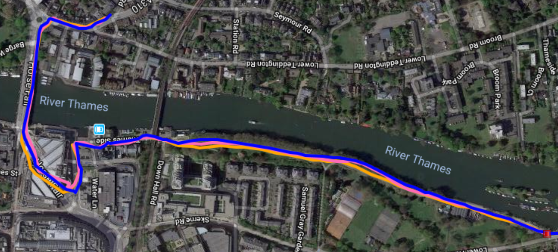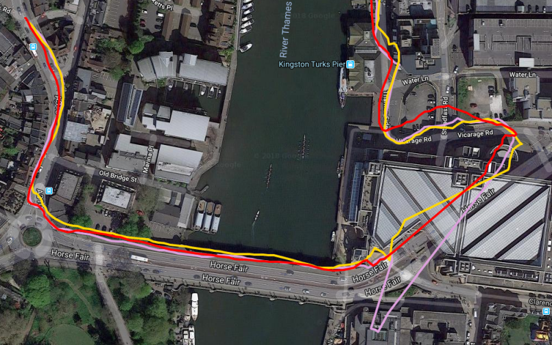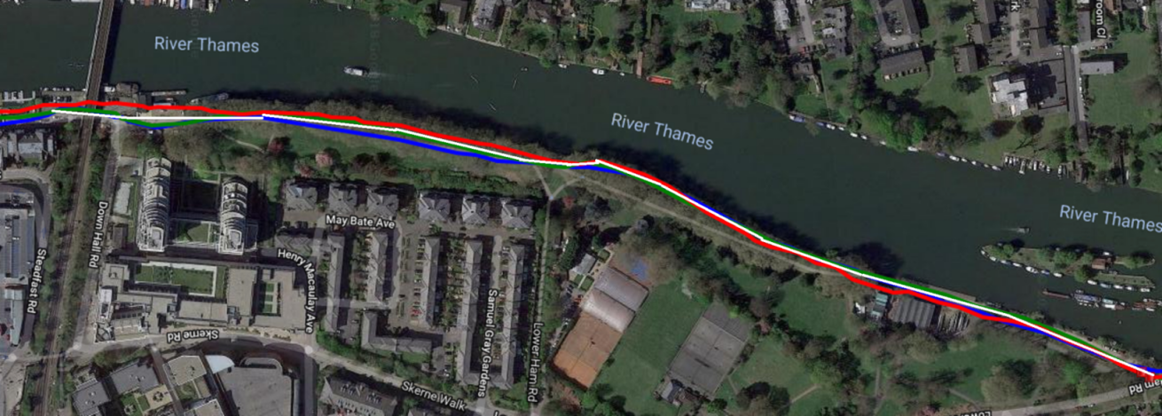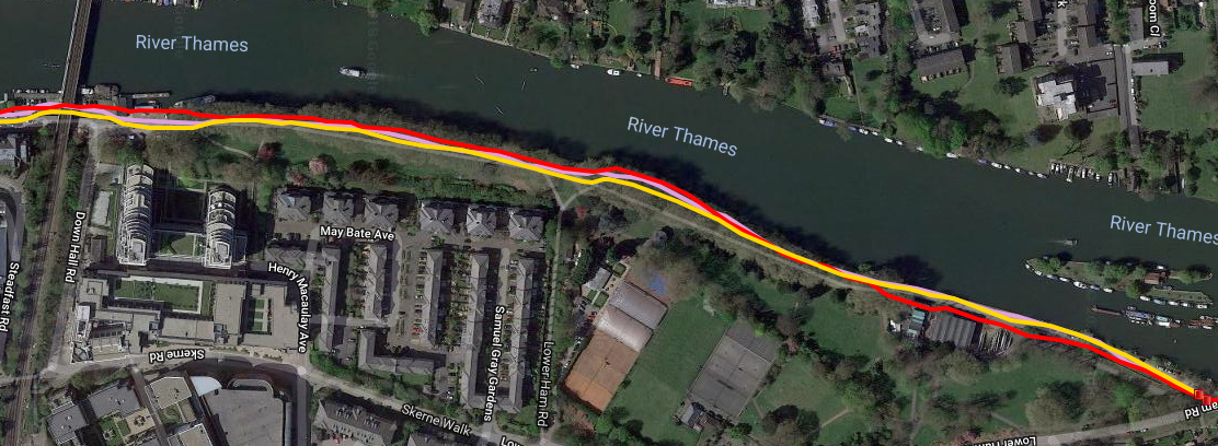 So there are some quite large variations. Maybe the blue track is the best. From the VERY many runs I’ve done on this section, I would say that the 3 Suunto SPARTAN tracks shown above are DEFINITELY WELL on the GOOD side of average. But you can see as well as me that in the middle under the words ‘River Thames’ there is probably a 10m gap between the blue and orange lines. Clear improvement is possible in some situations.