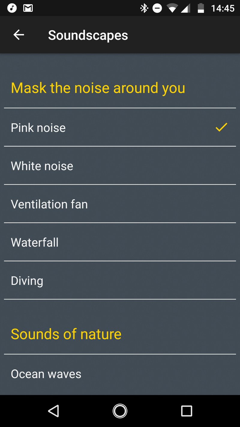 - The soundscapes are interesting to a point. I liked the ‘pink noise’ The pink noise is a less harsh version of white noise and would be ideal for blocking out all ambient noise, for example when going to sleep. However, if you sleep on your side the earbuds will almost certainly inhibit any attempts you make to go to sleep wearing them.