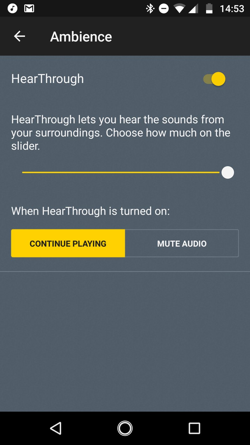 - Hear through is a handy feature that lets you hear that oncoming lorry through the music you are playing. Chances are this will have ZERO impact on your road safety so don’t cycle with these on the road. Around the house, however, it’s quite nice to be able to hear the doorbell ring and, sometimes, quite nice to be able to blot out other household sounds eg people asking me to do stuff when there are gadgets to be played with 😉