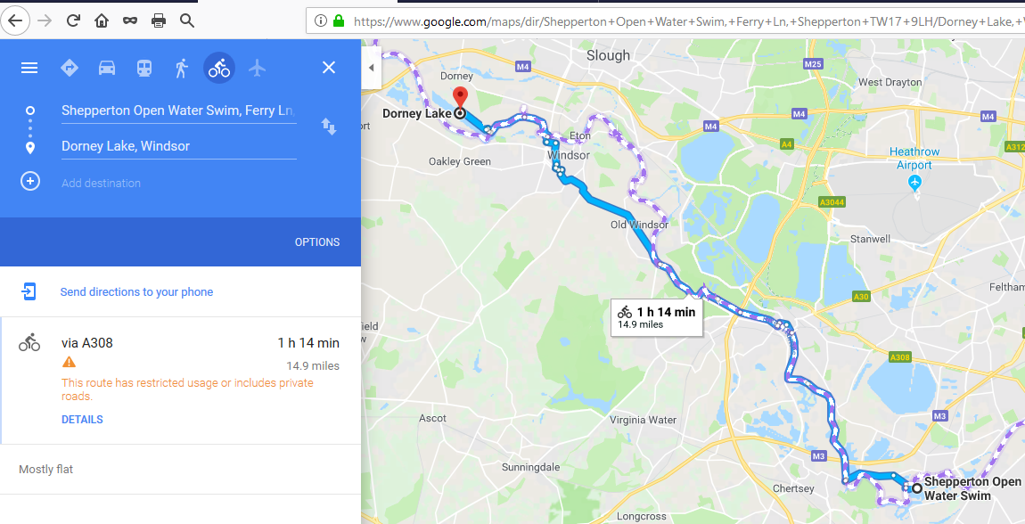 Here is the url: https://www.google.com/maps/dir/Shepperton+Open+Water+Swim,+Ferry+Ln,+Shepperton+TW17+9LH/Dorney+Lake,+Windsor/@51.3204933,-0.3798118,11.75z/data=!4m14!4m13!1m5!1m1!1s0x487675cd7e80aa01:0x1ce4695c1b2d0ceb!2m2!1d-0.453186!2d51.3866735!1m5!1m1!1s0x48767ca1b1609b57:0x48767ca19c9440f6!2m2!1d-0.6634836!2d51.4937557!3e1for a bike trip from Shepperton Open Water Swim to Eton Dorney. The route is in blue on the map and you can also see the purple/white dotted line which I think is the off-road Thames Tow path. The point of showing the off-road path is that such paths can be taken into account by Google Maps and you can also MUCH more easily drag parts of Google’s mapped routes than, for example, in Garmin Connect.