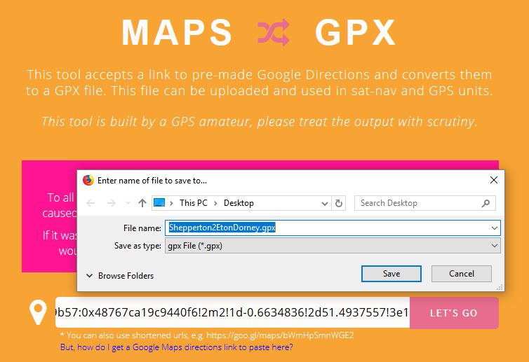 Click “Let’s go” and save a file with the name of your choice to the location of your choice. I chose Shepperton2EtonDorney.gpx on my desktop.