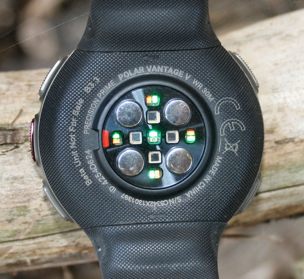 Hopefully you can see on the following image that the Precision Prime optical HR unit is a ‘bump’ on the back on the Vantage – it’s tricky to measure but it’s something like 1mm or 2mm. This ‘bump’ is pushed into the skin and is one strategy to both achieve a better contact as well as to keep ambient light OUT and the LED lights IN the sensor’s active area. This ‘bump’ has also been previously used by other manufacturers and indeed on the M600/M430 by Polar themselves.