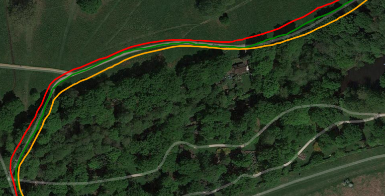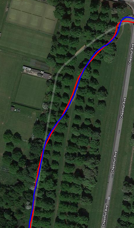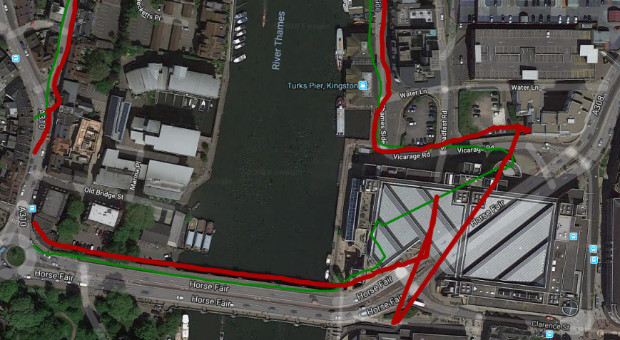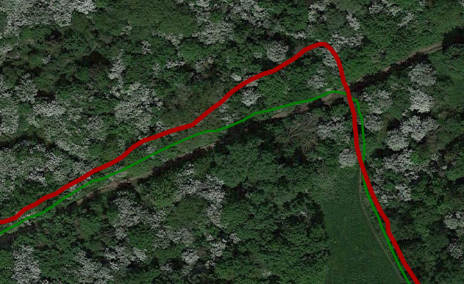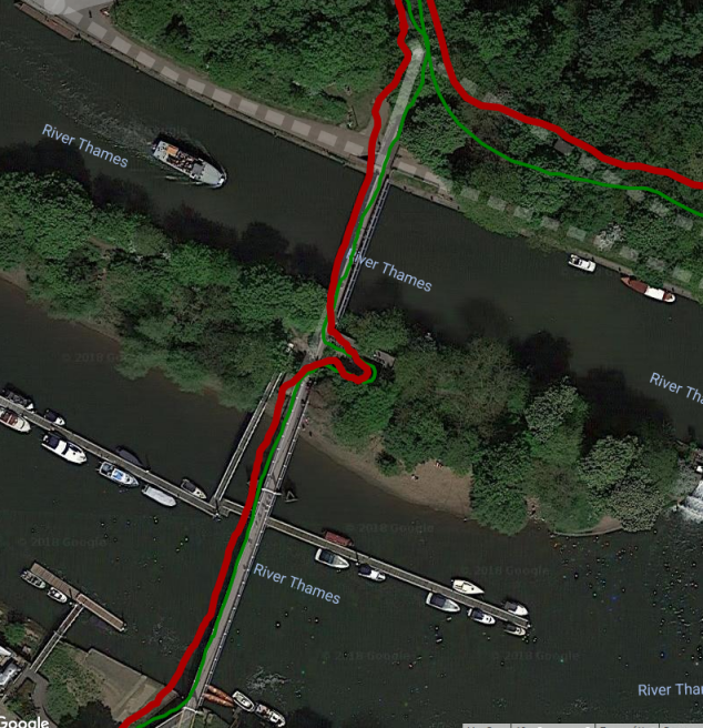 Here is another place that I once used to see which watches could correctly put my track on a narrow footbridge. the Polar does very well here – IIRC only the Microsoft Band managed anything better about 4 years ago (probably more luck than GPS-engineering)!!