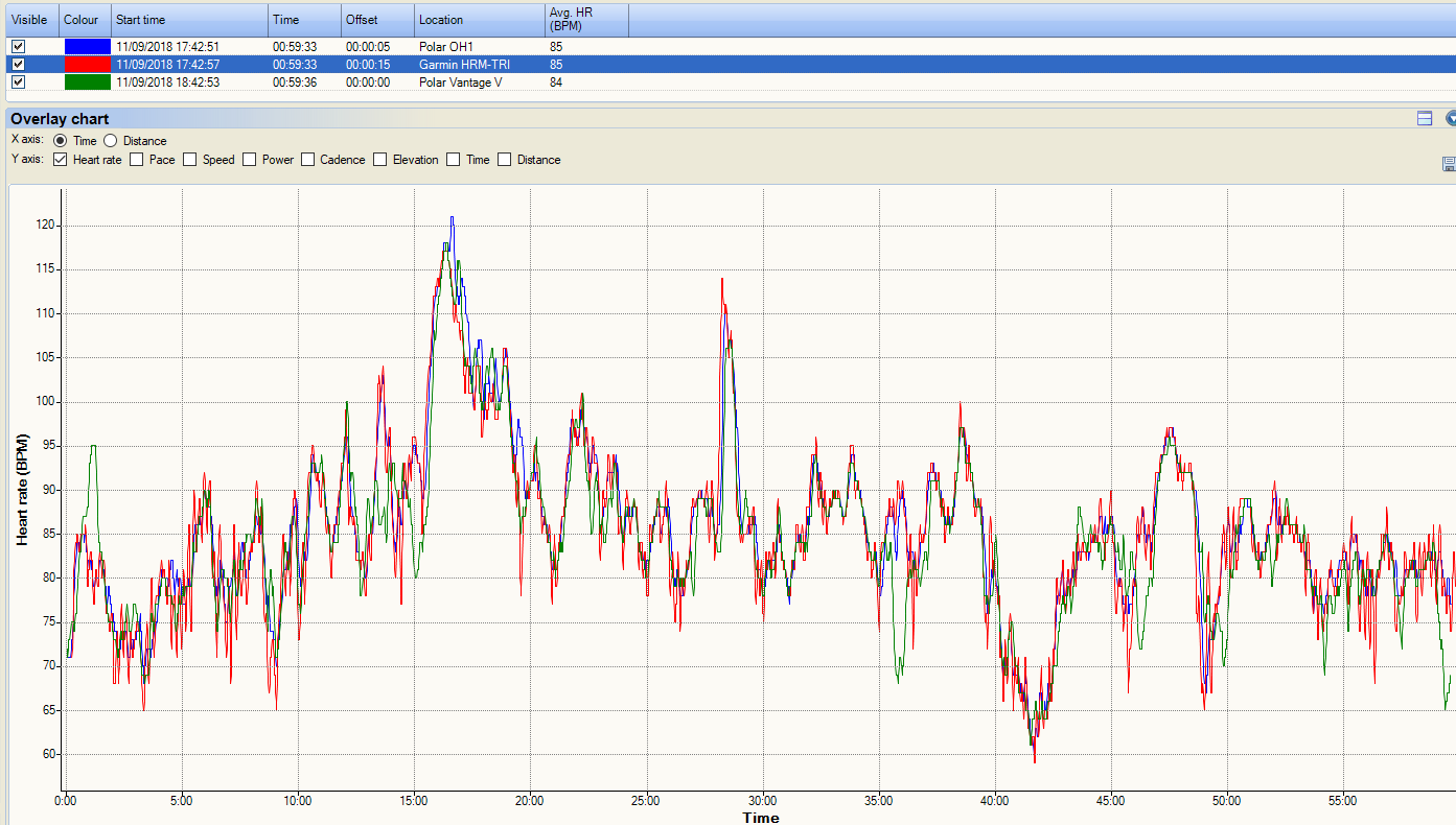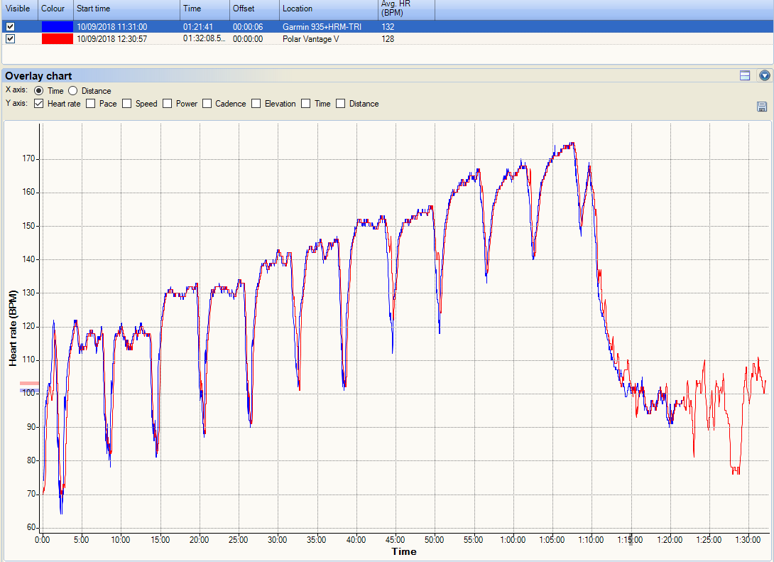 Here is a maximal test on a trainer with a Garmin HRM-TRI alongside. There was also a Polar OH1 outputting to the Humon Hex app whilst performing a MOXY 515 test – but I have not yet got that data off the Hex. A turbo trainer can be an easy test for oHR as there are few motion artefacts that are produced. However, the Vantage V handled the 175bpm heart rate nicely enough. 175bpm is not far off my cycling HRmax.