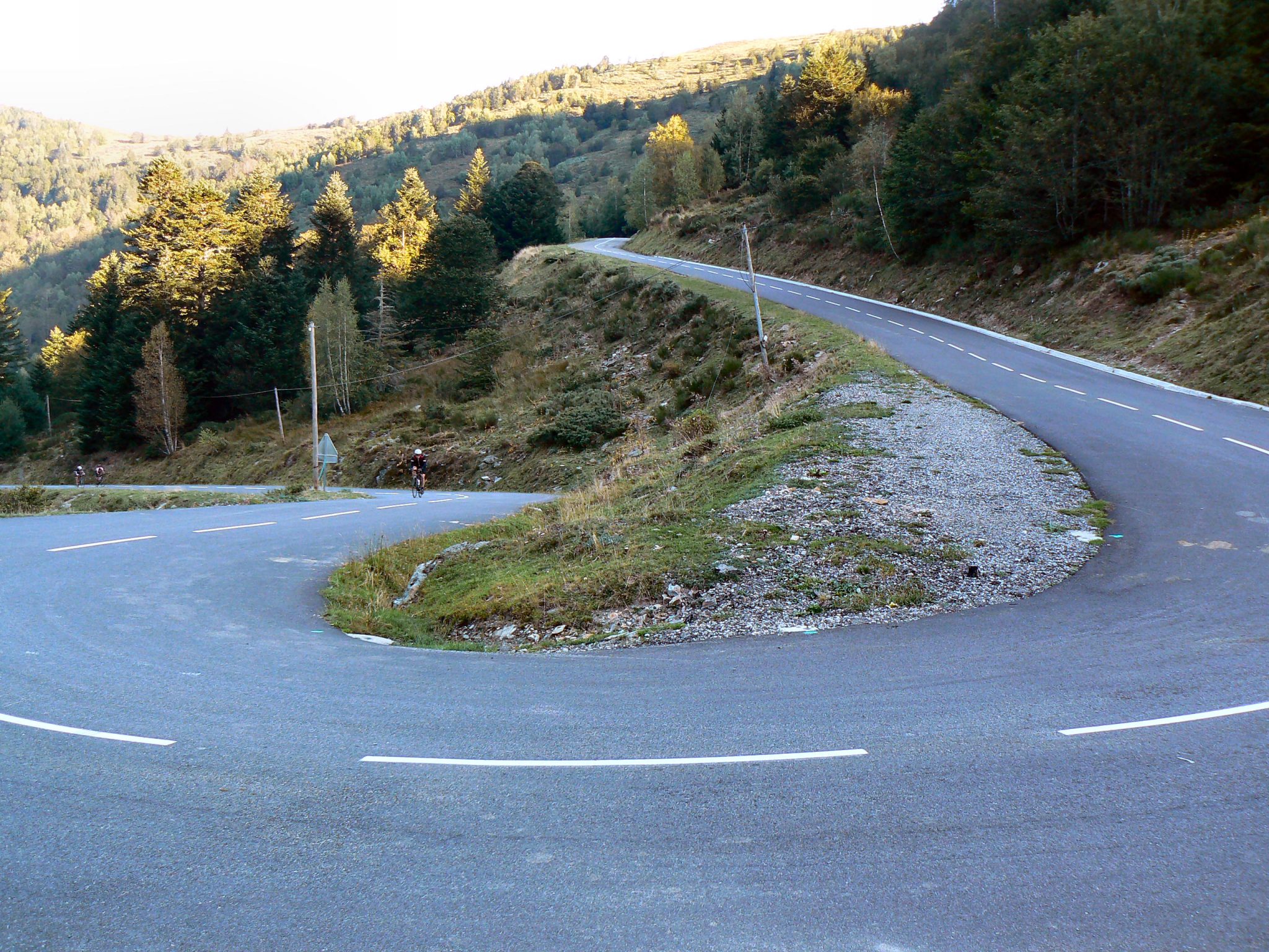 There are two separate series of twisting ‘Italian Job‘ bends on the climb up the Pailheres. I think these are the first bends.