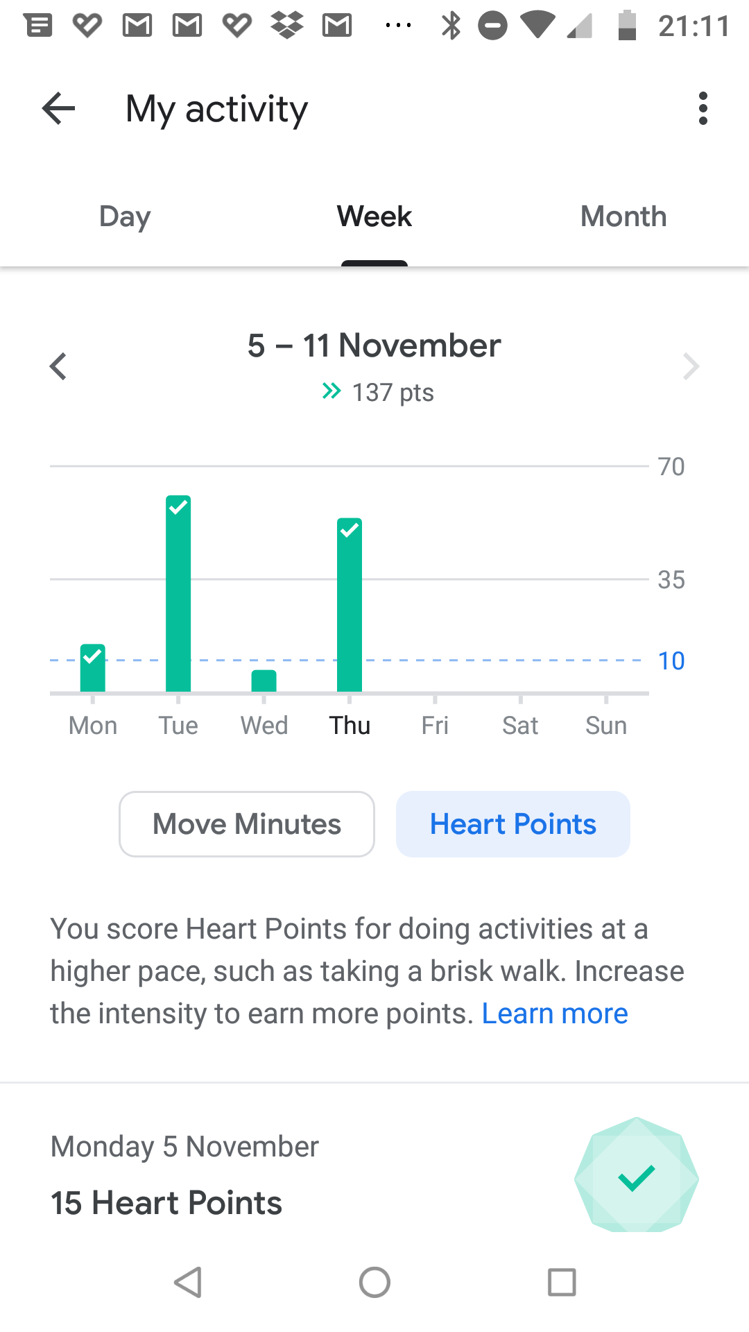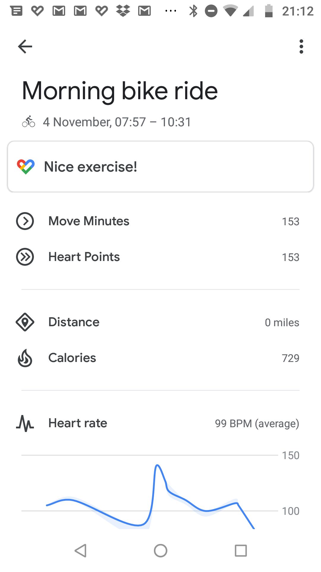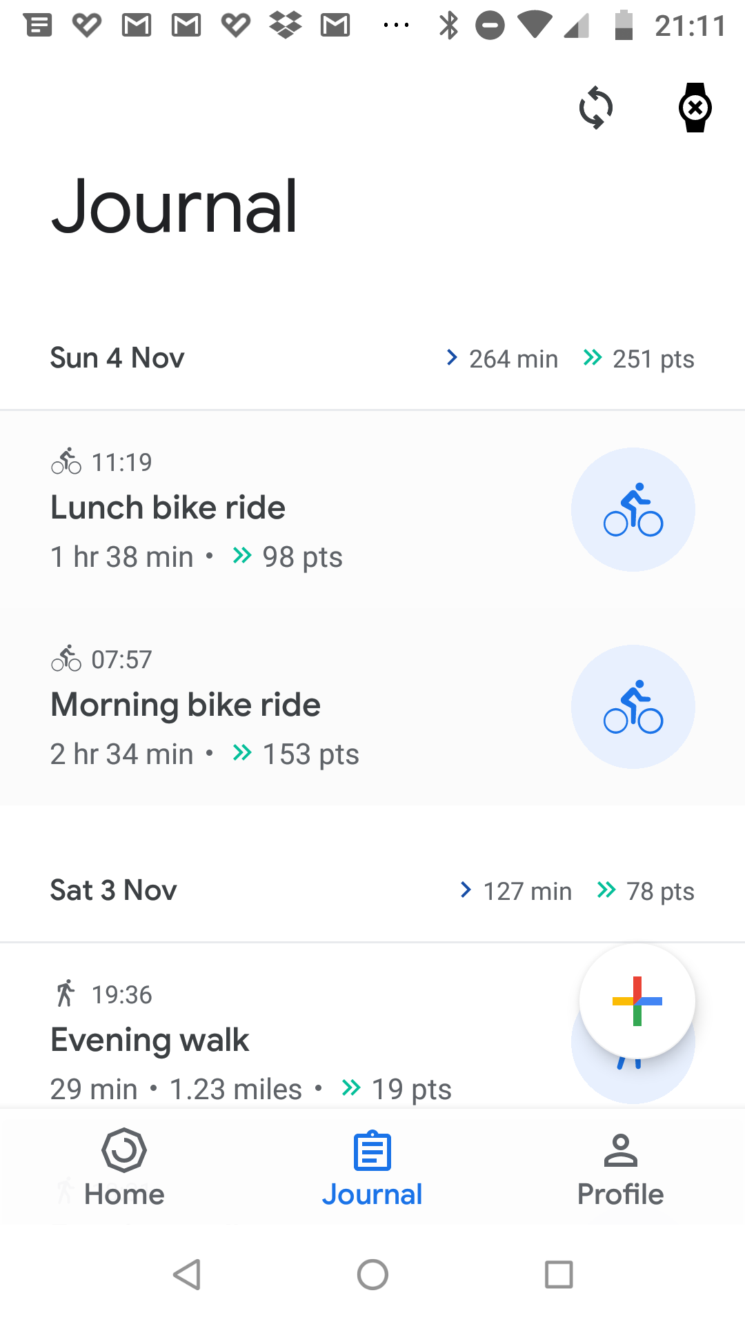 The exercise tiles appear if you complete a workout – some activities like this 75-minute run were automatically detected