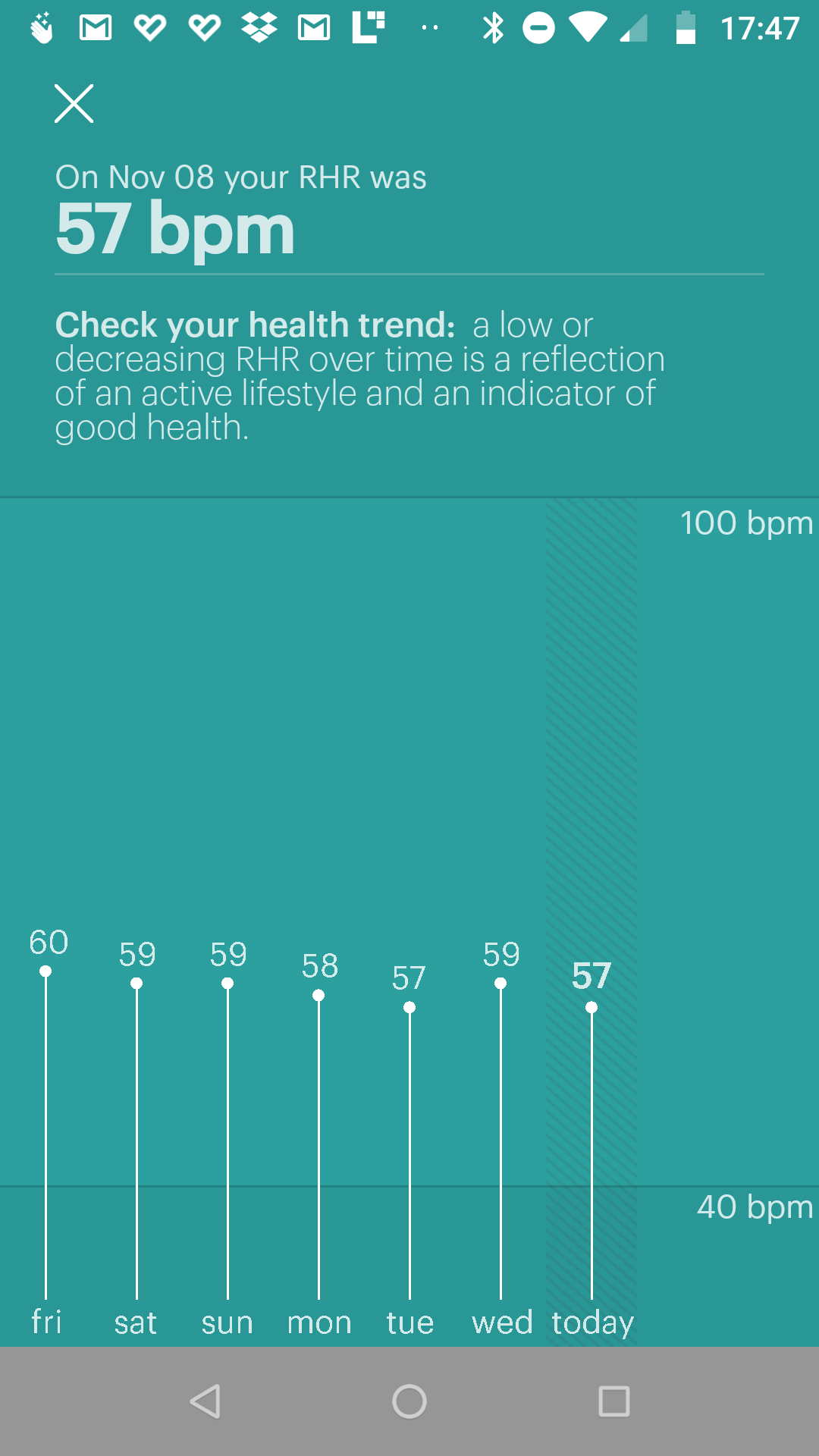 As shown below this will give you: a trend of resting HR over time; your sleep trend over time; and more minute-by-minute detail on any workout – you can even tap and hold the activity bars to see more detail.