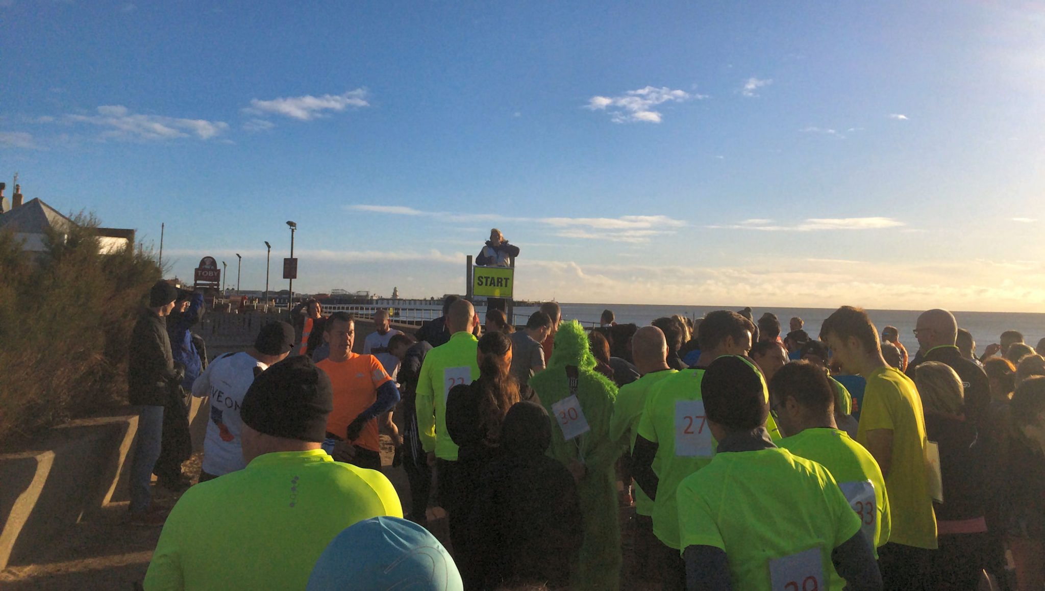 The course is three laps and, as a seafront course, I was expecting it to be totally flat. It’s not! You first head out along the upper promenade, which is on a long, upward incline. There are sections of flat, but it is definitely uphill overall. The course goes almost as far as the pier, but the turning point, which is marshalled, is just before it. Here, you take a sharp right and head down a short, steep hill. This section is very narrow and only wide enough for two runners, so there is a chance of congestion around here. At the bottom of the hill the course returns back along the lower promenade, which is completely flat. Then repeat it all again… twice… though on the final lap, instead of turning right and heading uphill again, you carry straight on past the Toby Carvery.