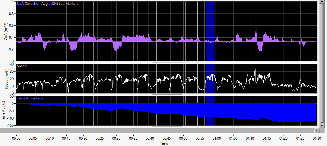 - The lap markers are merely guides for you. After you select a range as shown with the vertical blue bar then the CdA for that period appears in the top left-hand corner (0.324 is shown above)