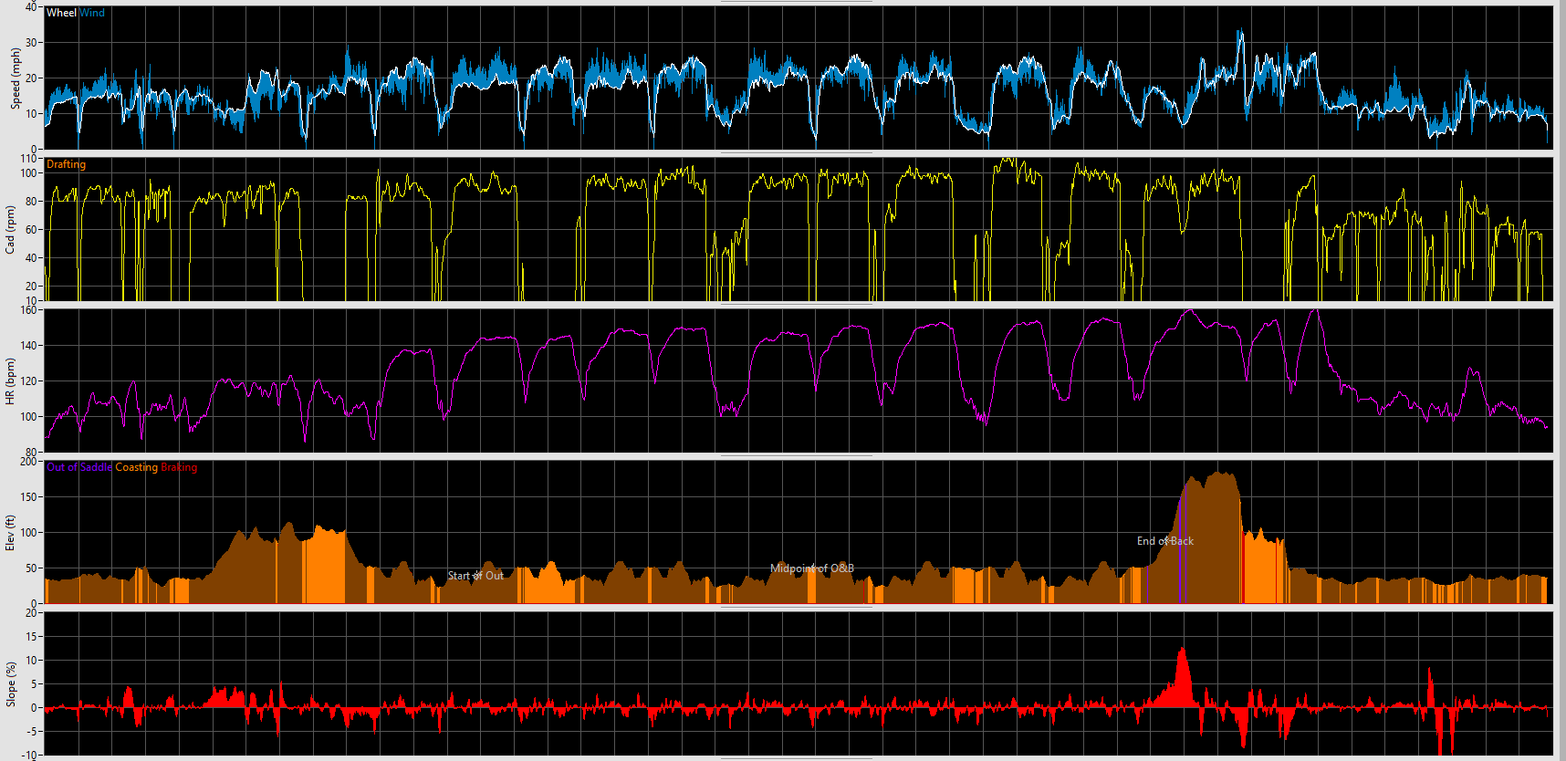 At the end of the manipulation you get a fairly straightforward ride chart with info as shown below (and more metrics, not shown). The only unusual part of this chart is the white ‘speed’ line in the top graph. The blue vertical lines, image below, indicate the extent of the tailwind or if the blue lines go up, the headwind. No CdA info is shown at this stage. (Although that’s technically not true, if no HRM is paired then the HR graph will show CdA)
