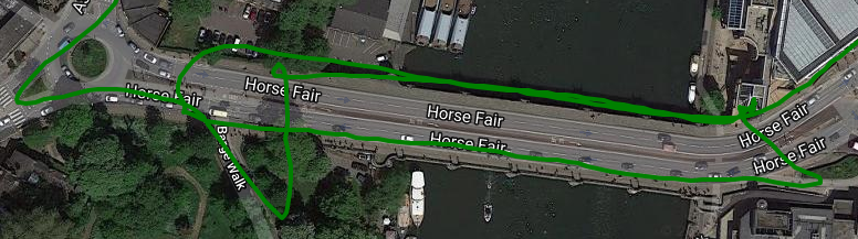 The green V800 track IS pretty much the route I actually took, which was going under the main bridge at each and going under the long Horse Fair tunnel to the right. It looks like this when zoomed in a tad more.