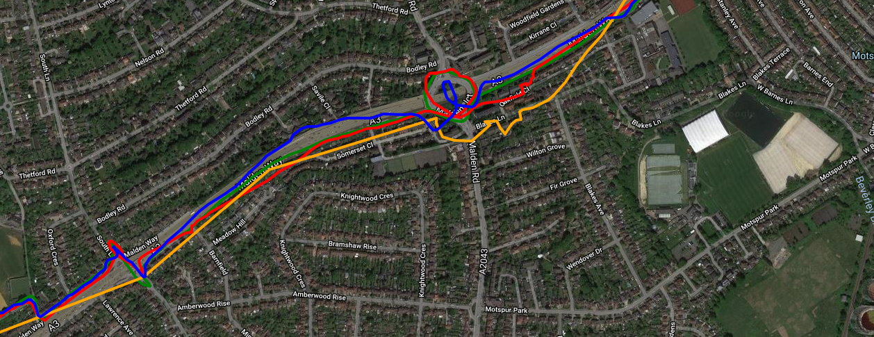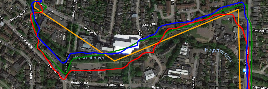 Even the V800 is wrong here. When I was running next to the words “Hogsmill River” is also running next to a large, 3m high, metal fence (hence bad GPS reception)