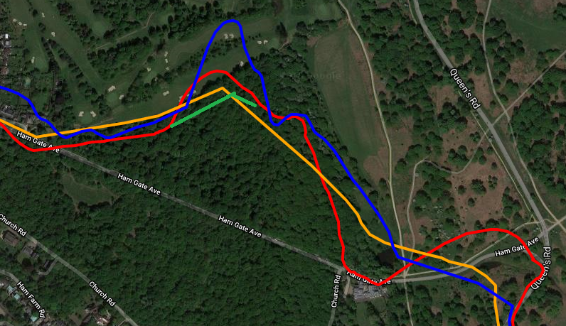 I’ve drawn on the image the section, in green, where the V800 failed to record (my bad). Through the trees, again, the Garmin 935 in red is just about right (apart from near the green bit). It’s also out on the right-hand side as well.
