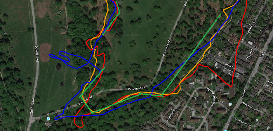 I’ve drawn on the image the section, in green, where the V800 failed to record (my bad). Through the trees, again, the Garmin 935 in red is just about right (apart from near the green bit). It’s also out on the right-hand side as well.