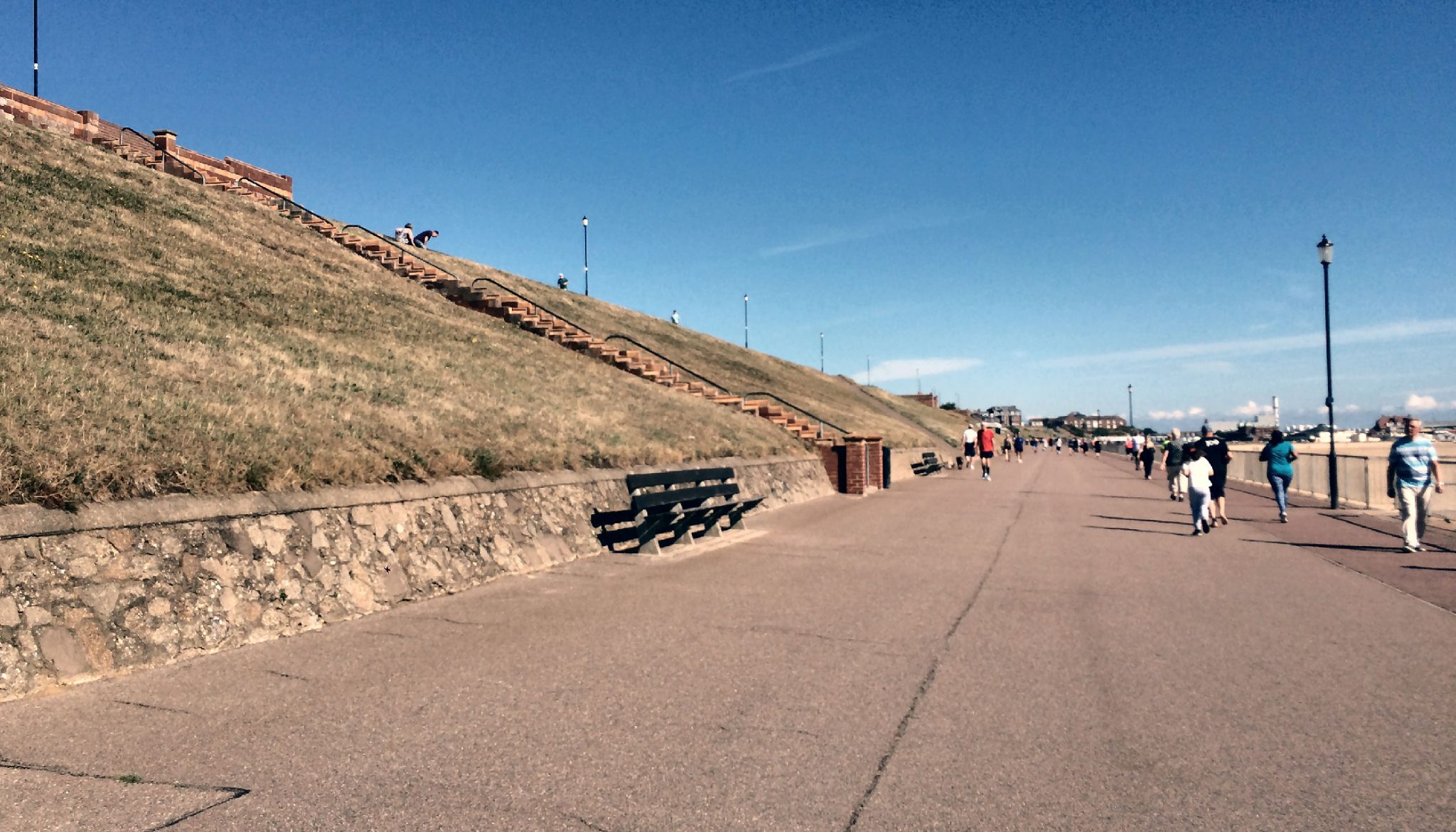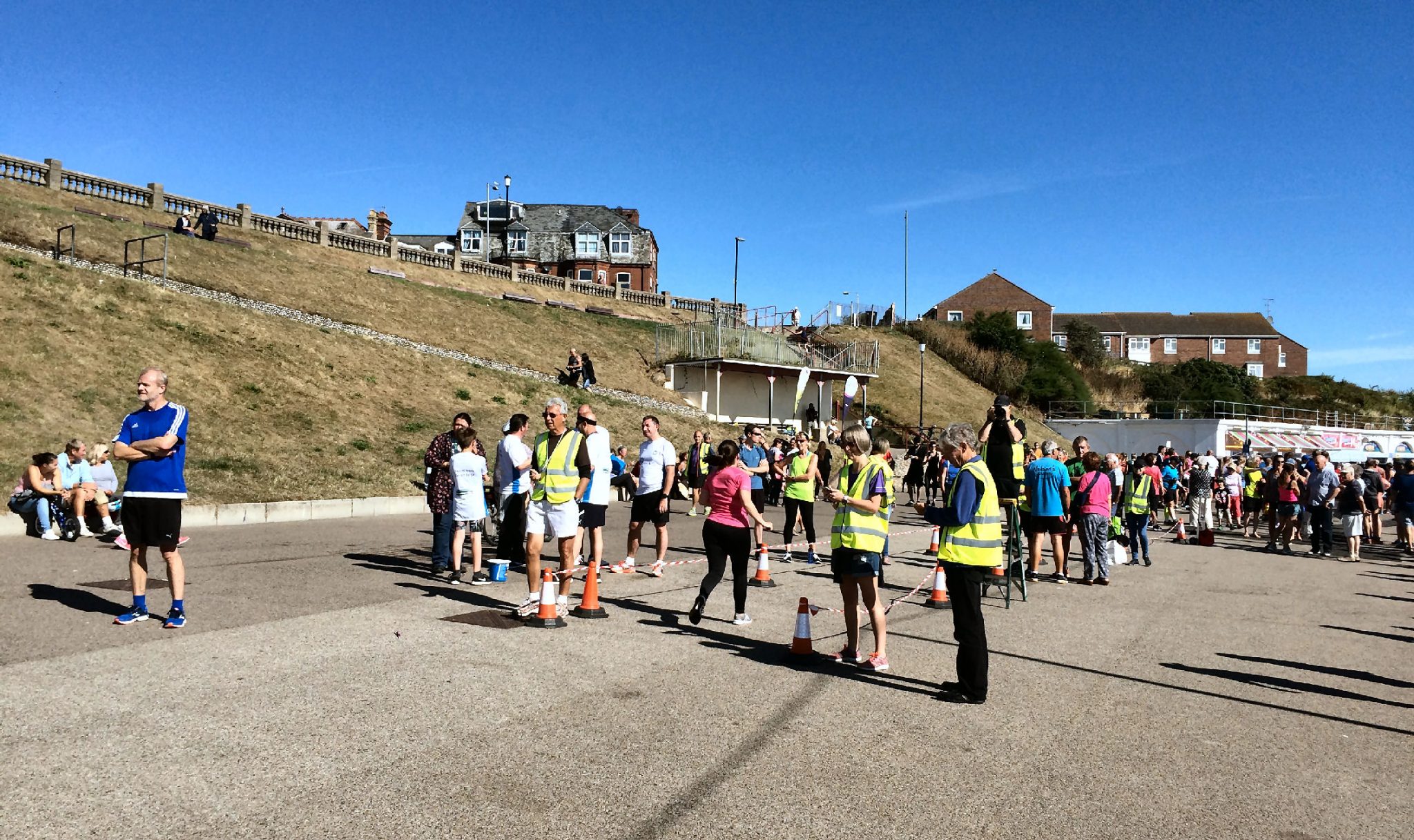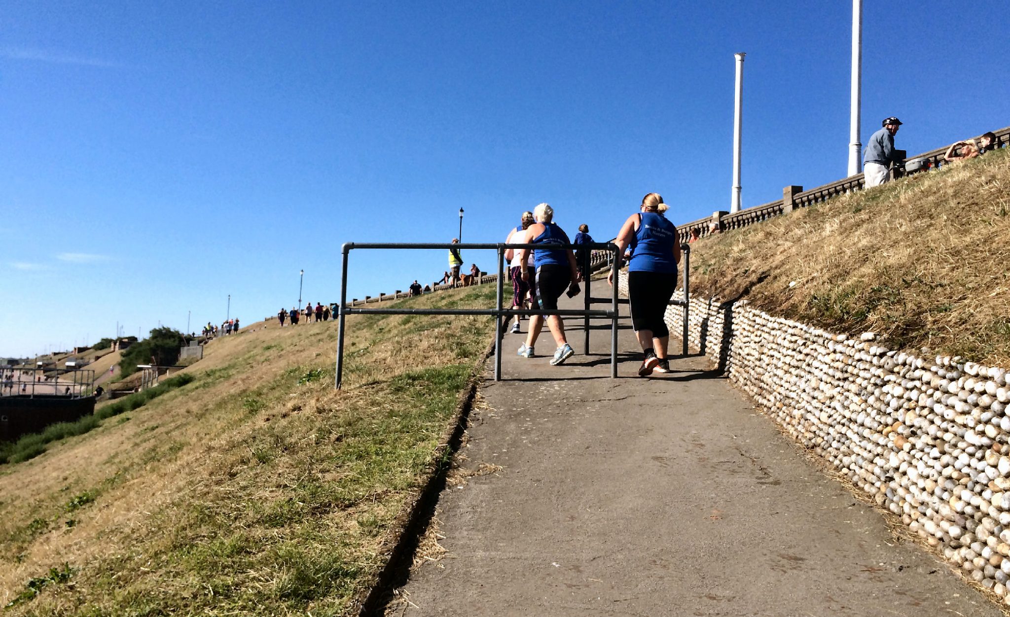 It’s a two-lap course, starting on the upper prom. You run along it for about 1.25k and although the pathway is narrow, there are wide areas of grass to the side which the parkrunners take advantage of when overtaking. At the end of the upper prom section, you will be marshalled down a steep-ish hill before returning back along the lower prom in the direction that you came from. The end of the lower prom section marks the completion of lap one, at which point you’ll be directed up a short-but-steep hill to the upper prom, back to where you started. Then you get to do it all again for lap two, except that you don’t do the uphill on the second lap, as the finish is on the lower prom where there is a bit more space. So there is a net downhill on this course, which is good (unless you particularly enjoy running uphill). The whole course is on concrete or tarmac and, with a marshal at each end at the turning points, it’s impossible to get lost.